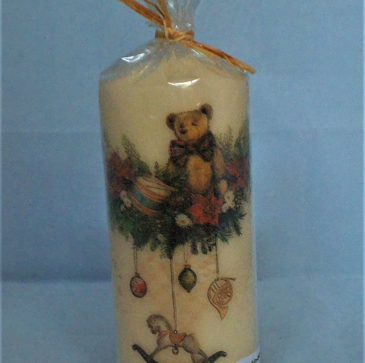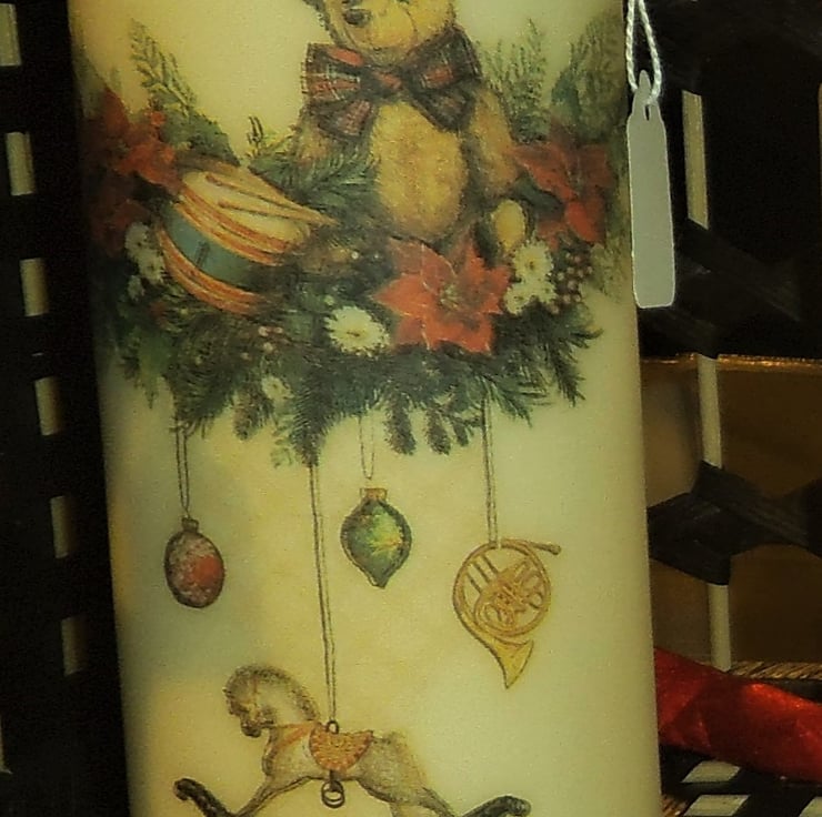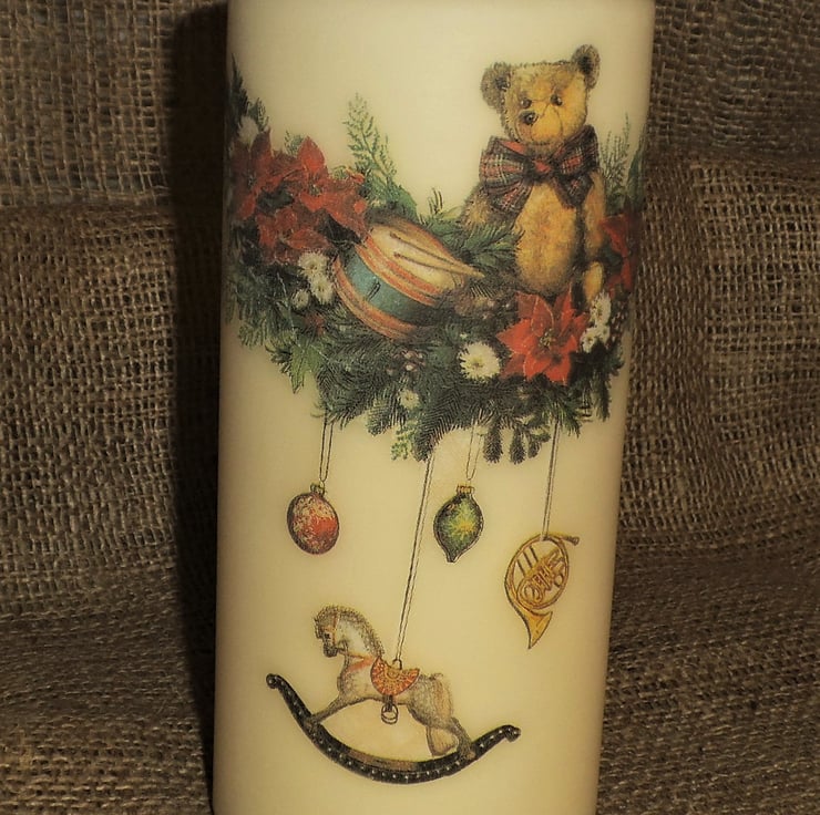 This tall, unscented cream candle is decorated with a very sweet image of a teddy and drum sitting atop a garland of festive greenery, and with baubles and decorations hanging from the garland, including a rocking horse.
