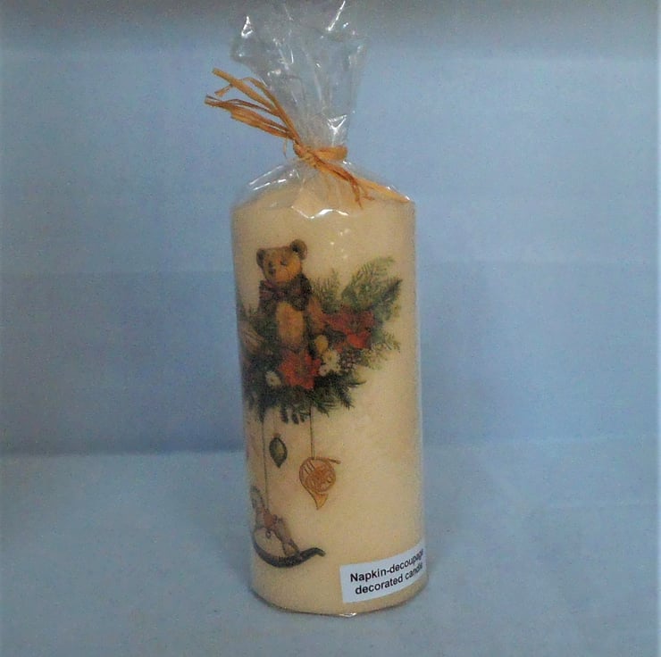 This candle can make a really attractive decoration in its own right, but as the image has been fixed with a liquid wax glue it can be lit.