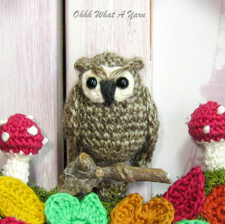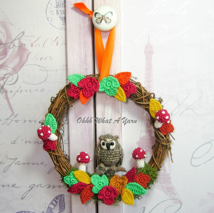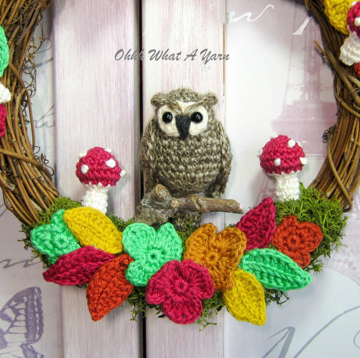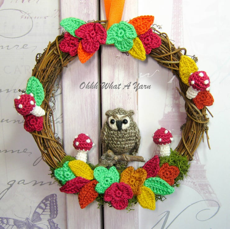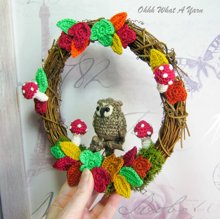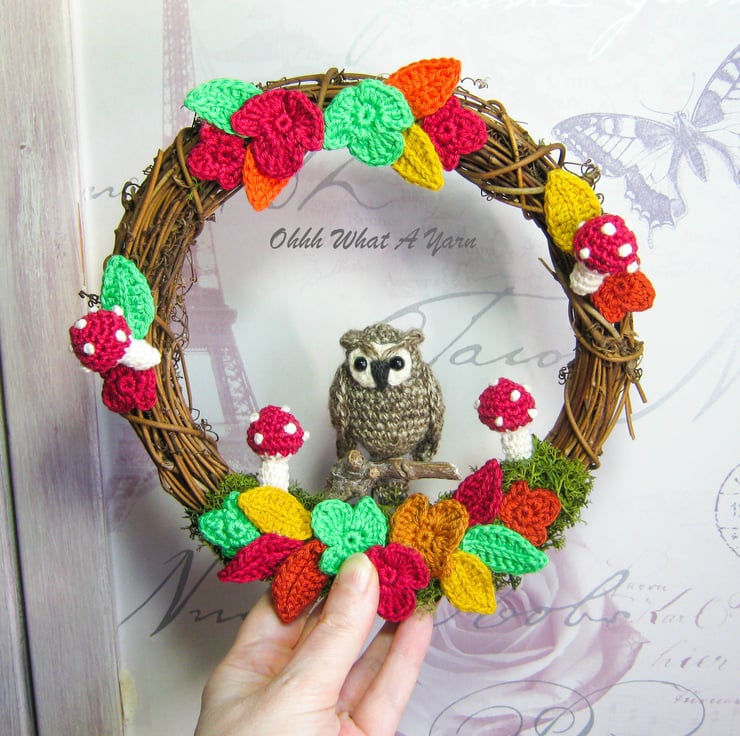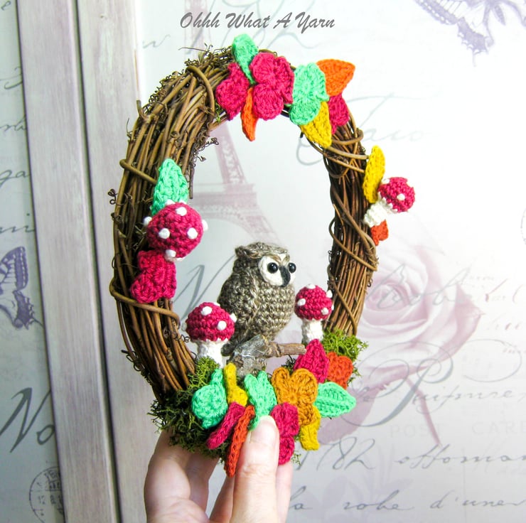 The little two-tone brown owl is perched on a wooden twig. The wreath is decorated with artificial reindeer moss, amigurumi shrooms and crocheted falling leaves in gorgeous autumn colours.