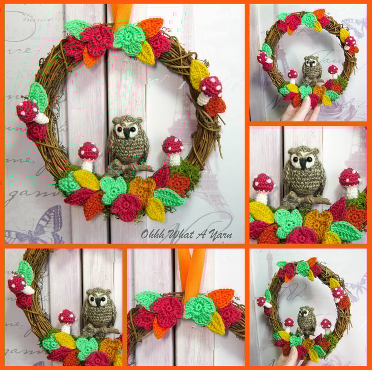 This cute autumn wreath has been adorned with lots of my crochet work.
