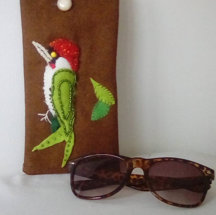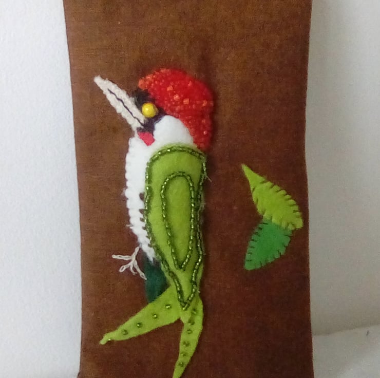 I have made this case using Linen fabric. The Woodpecker is made of wool felt. I have then hand sewn numerous tiny seed beads, so it felted the colours of the beautiful Woodpecker. The case is lined with wadding and cotton fabric and fasten with a button.