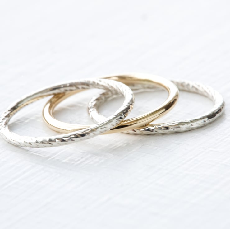 Handmade 14K Solid Yellow Gold & 925 Sterling Silver Stacking Rings - Set of 3 are made with 16 Gauge (1.3mm) 14K Solid Yellow Gold Wire (Smooth) and 16 Gauge (1.3mm) 925 Sterling Silver Twisted Diamond Cut Strip Wire (Hand Textured)