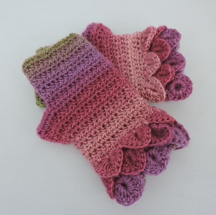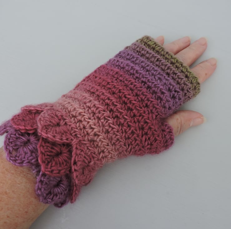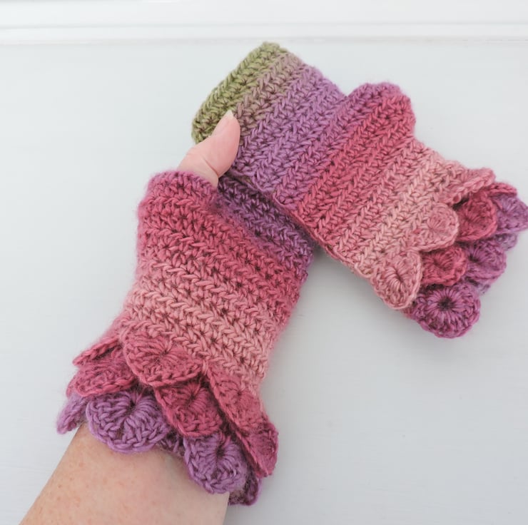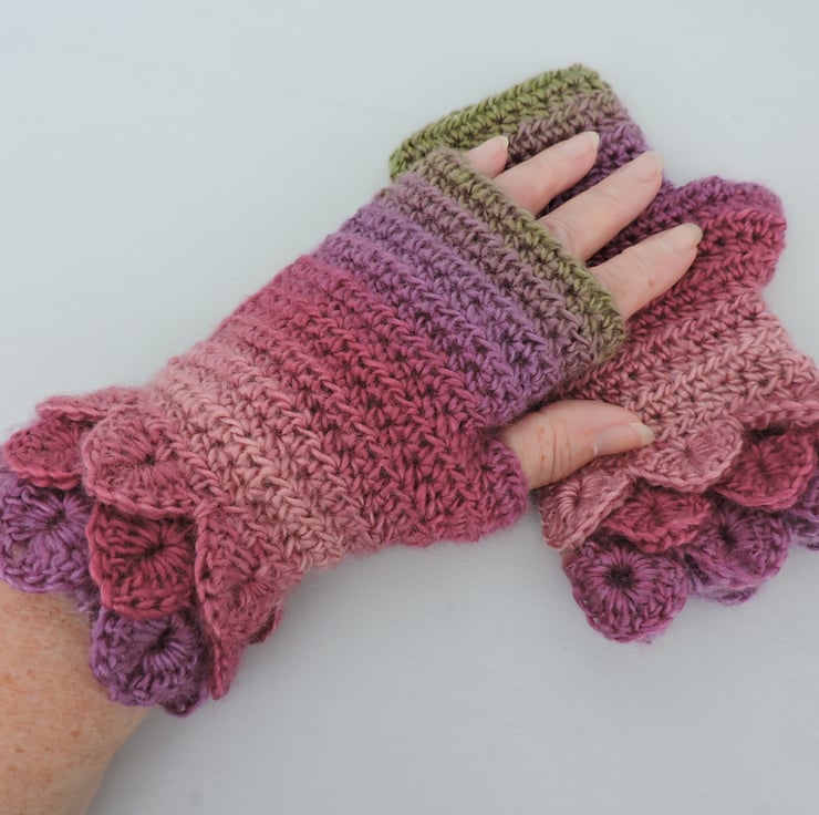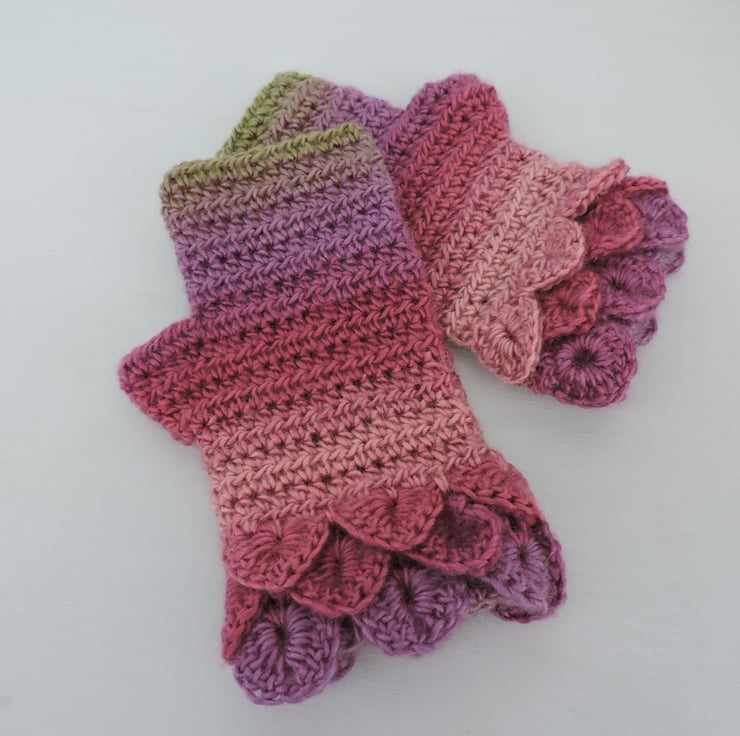 I've crocheted these dragon scale cuff fingerless mittens with a double knit multi tonal acrylic yarn. Pretty graduated colours of rose pink, mauve, pale pink and a hint of olive.. Dragon scale cuffs and a plain body. Warm and cosy, ideal for the cold weather