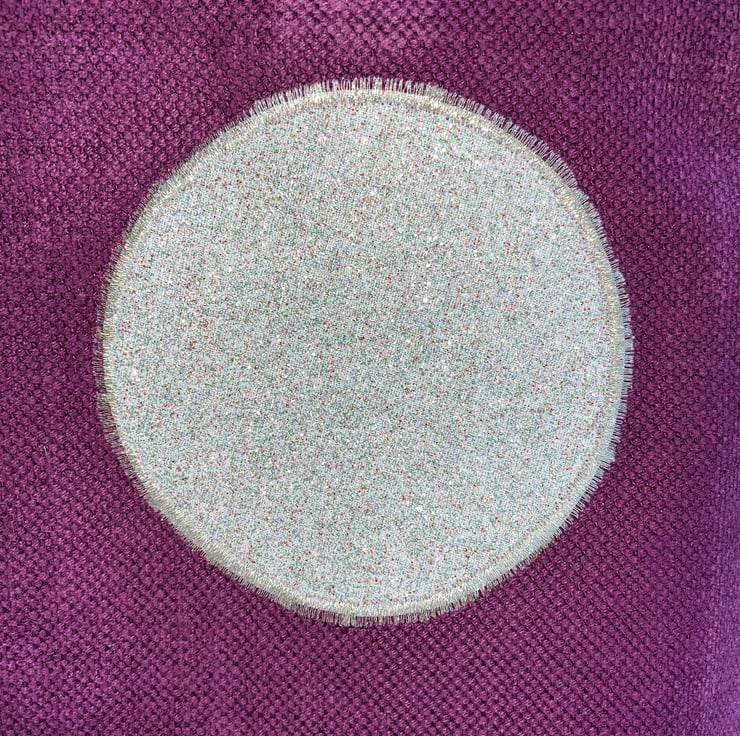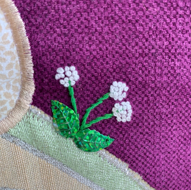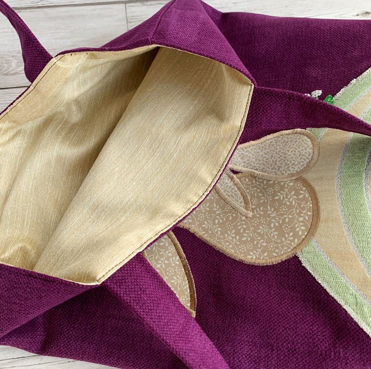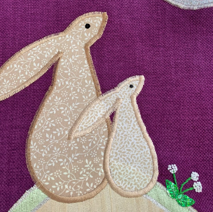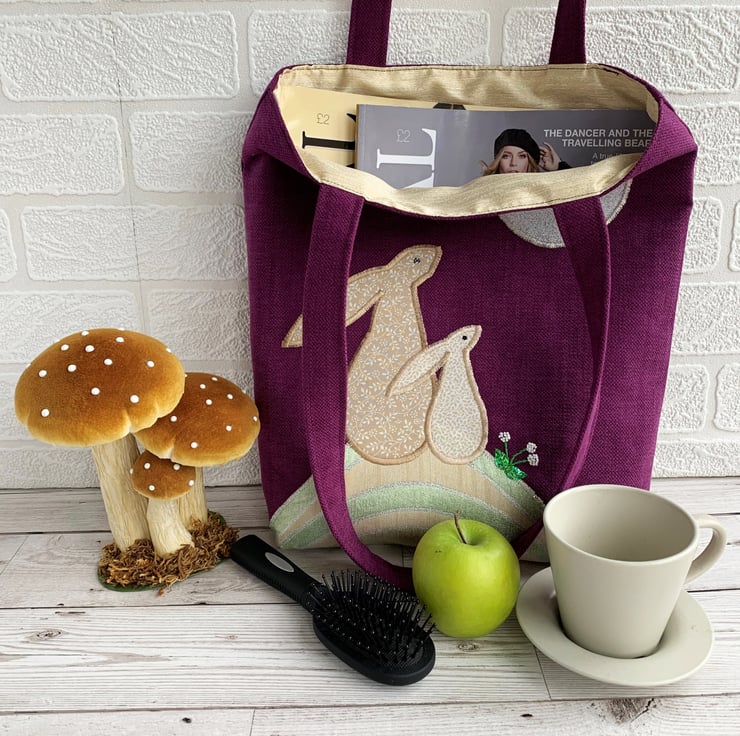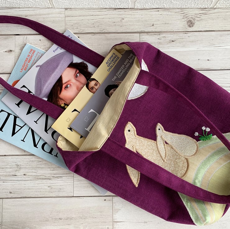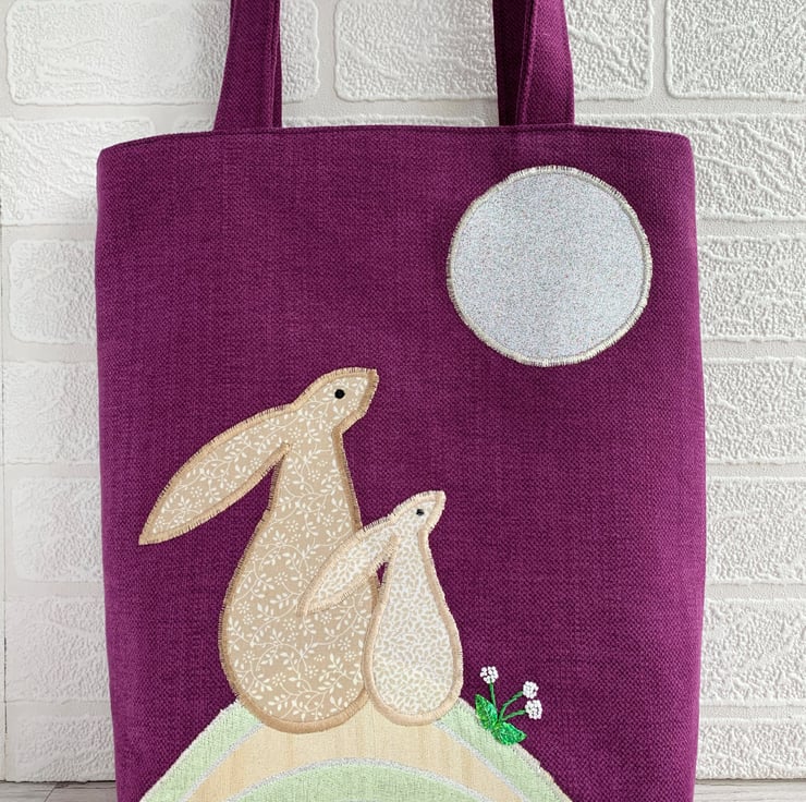 A purple tote bag with two moon gazing hares. The tote bag is made from a gorgeous vivid purple fabric and has an appliqué scene depicting two hares on a hill, gazing at the moon. The two moon gazing hares are made from co-ordinating beige and cream print fabrics. The larger hare is beige with a ditsy pattern of cream flowers and leaves. The smaller hare is cream with a beige ditsy leaf pattern. I've added tiny black sequins for eyes. The full moon is made from a lovely sparkly silver fabric edged with metallic silver coloured thread. The hill is made from fabric with a pattern of curved stripes in shades of cream, pale green and lustrous silver. I’ve added hand embroidered dandelion clocks with holographic green leaf-shaped sequins for the leaves. The bag is lined with cream fabric with slight sheen.