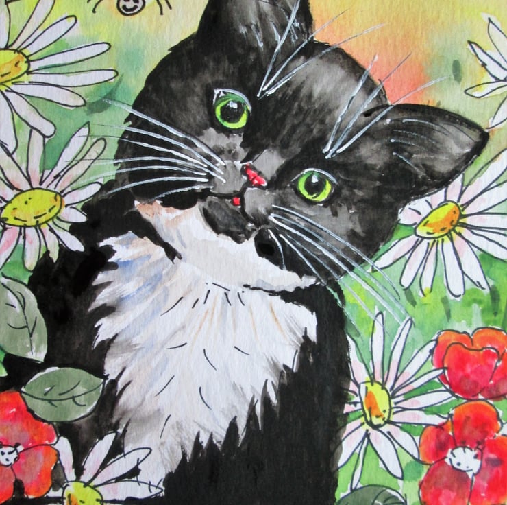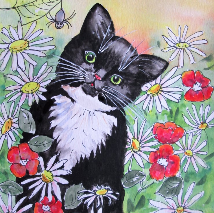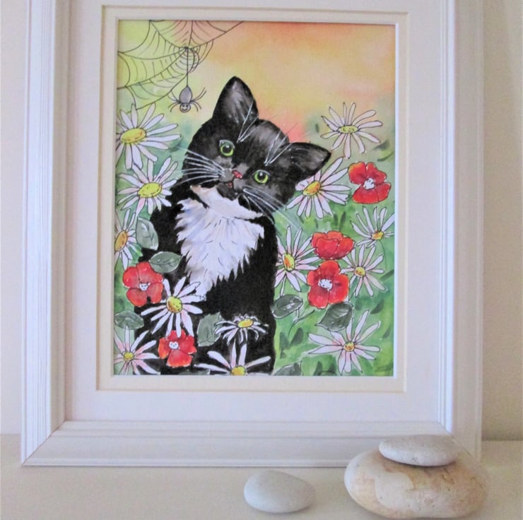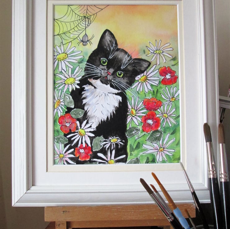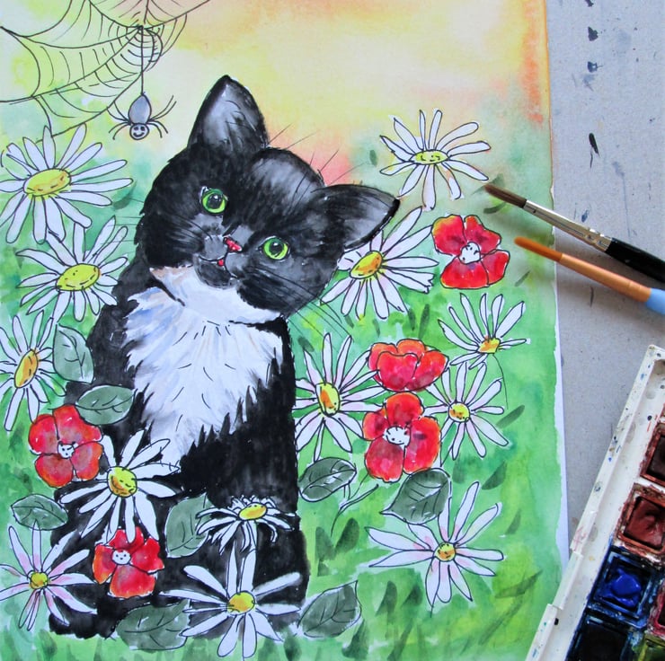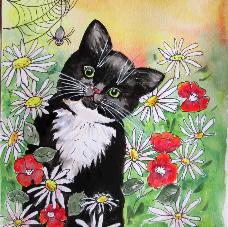 An original pen and watercolour wash painting of an innocent kitten, a spider and flowers. Kitten in flower garden.