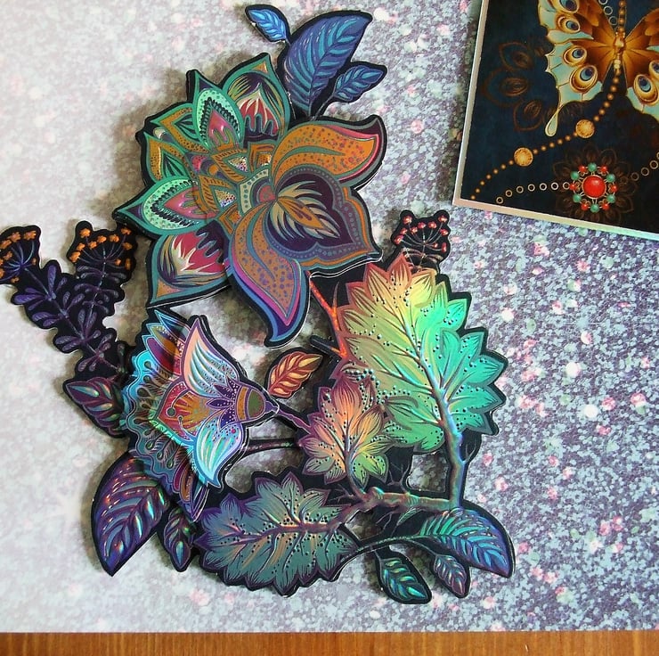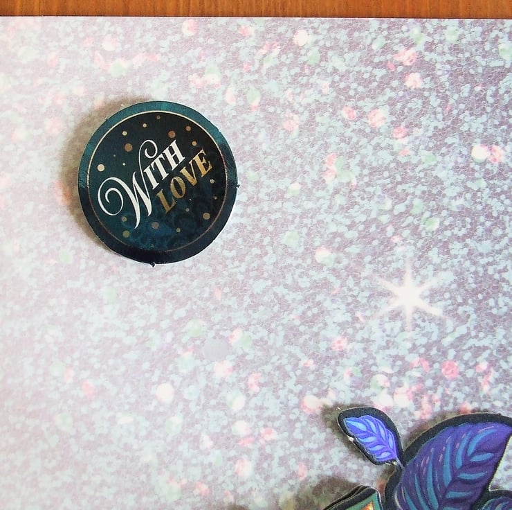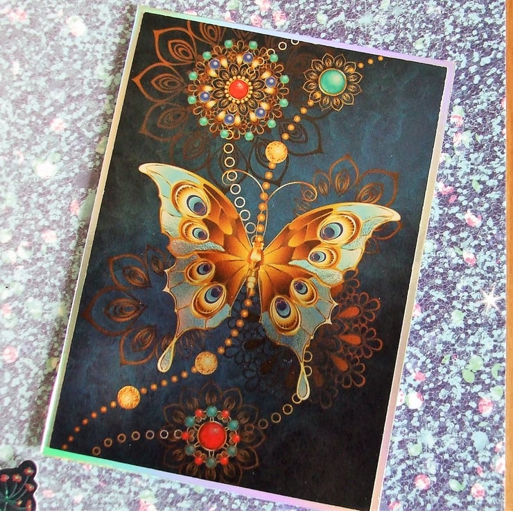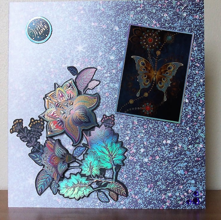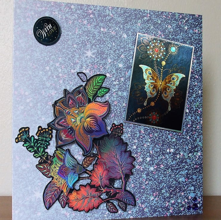 The front of the card is printed in varying shades of blues, greens, purples and pink to give the effect of glitter (please note it is not glittered so is completely smooth) In the bottom corner I have added a3D fantasy floral motif in similar colours, it is printed onto foiled card with a holographic finish so the colours on the flowers change as the light changes. In the top right corner is a topper which is printed on foiled card it features a butterfly against a background of floral motifs and strings of beads. There is a greeting in the top left corner with the words "With Love" and 3 blue-purple faux gems decorate the bottom right corner.