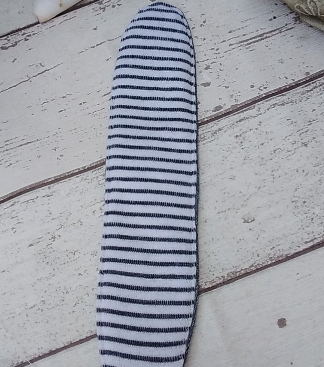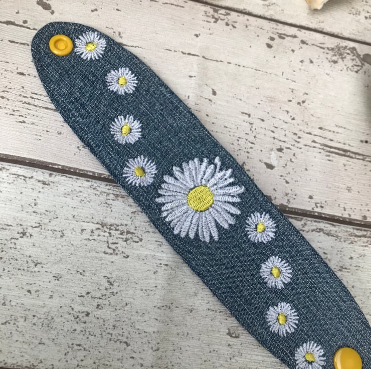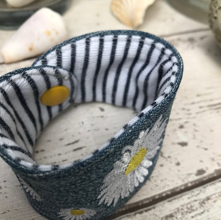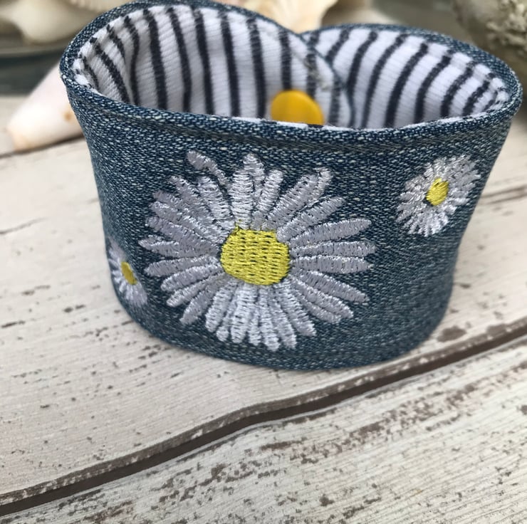 This cuff is lovely easy to wear up cycled denim fabric with jersey on the reverse. Machine embroidered with daisy.