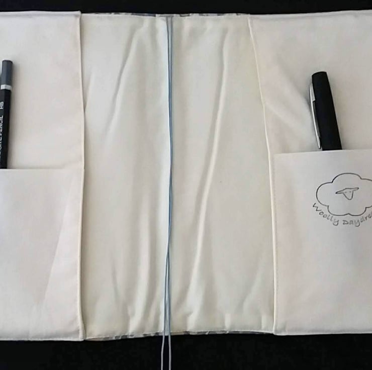 The lining is either cream calico or self fabric, with a pocket back and front. there are two beaded page keepers attached to the top centre.