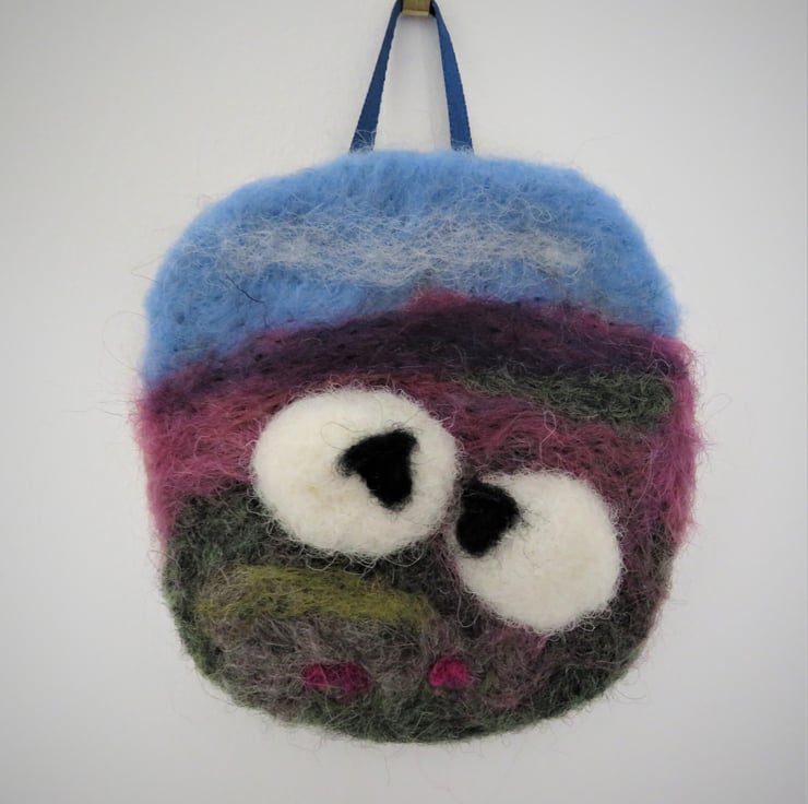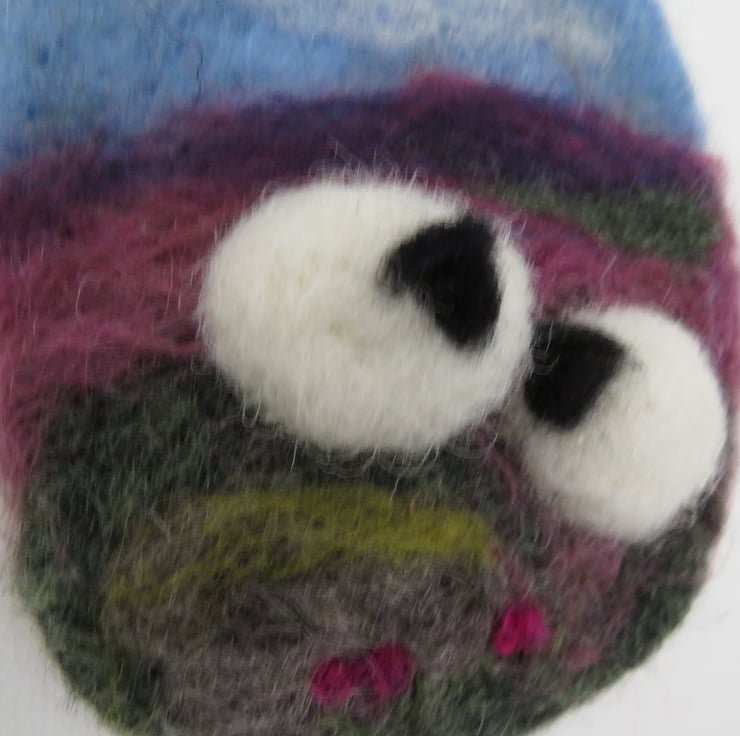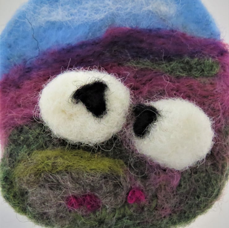 Pastoral scene of sheep in a Dales landscape.Wool felted in relief to give depth. Fixed to a wood slice and with blue ribbon hanging loop, a needle felted mini picture of sheepin the countryside . !0 cms round