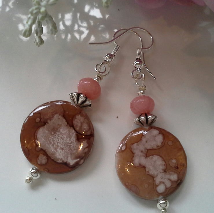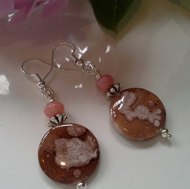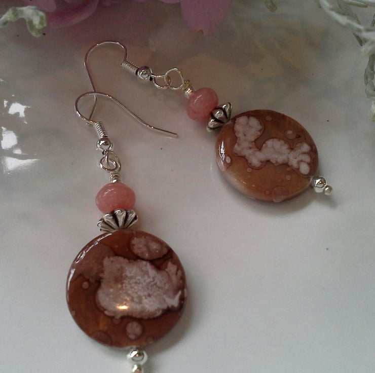 The earrings have been hand crafted using specialist dyed printed (permintant) treated mother of pearl 16mm flat coin cuts complimented with 6mm smooth polished jasper rounds. All other components are quality silver plated to reduce costs and making them more affordable.