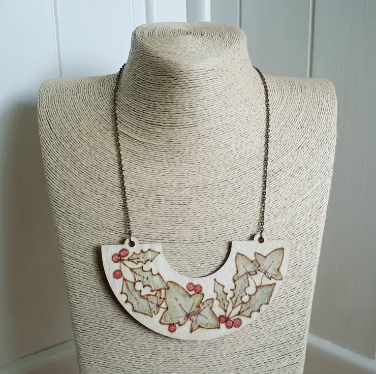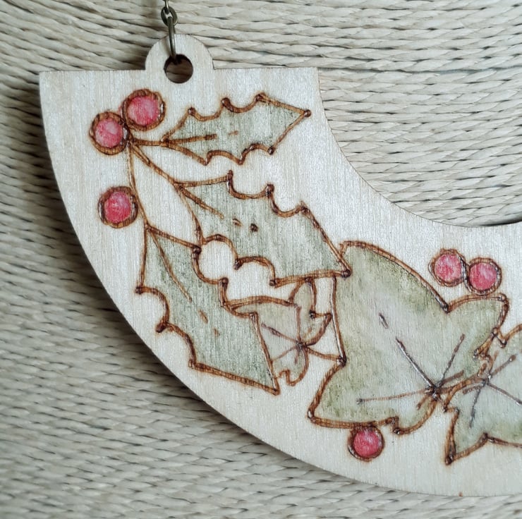 Wooden pendant illustrated with holly & ivy using pyrography (wood burning).