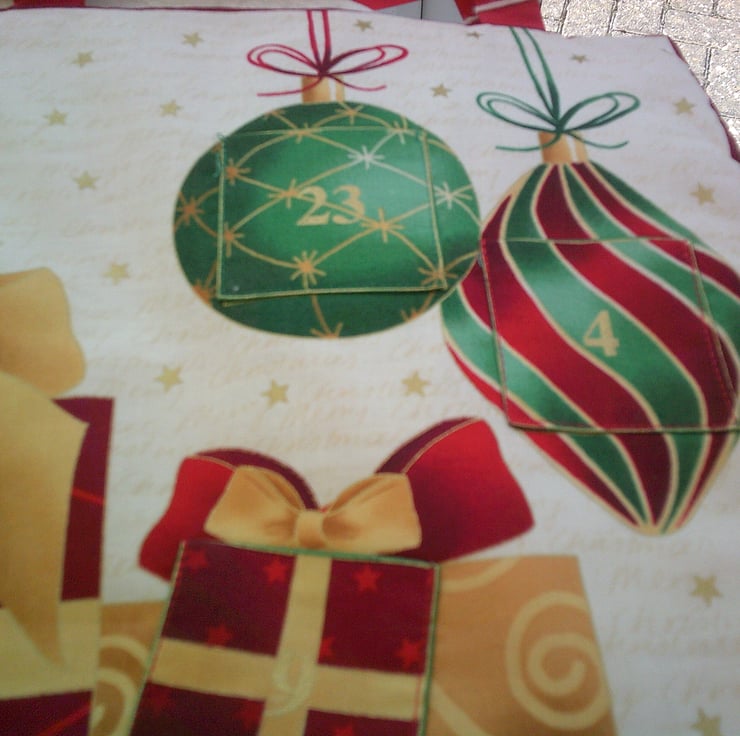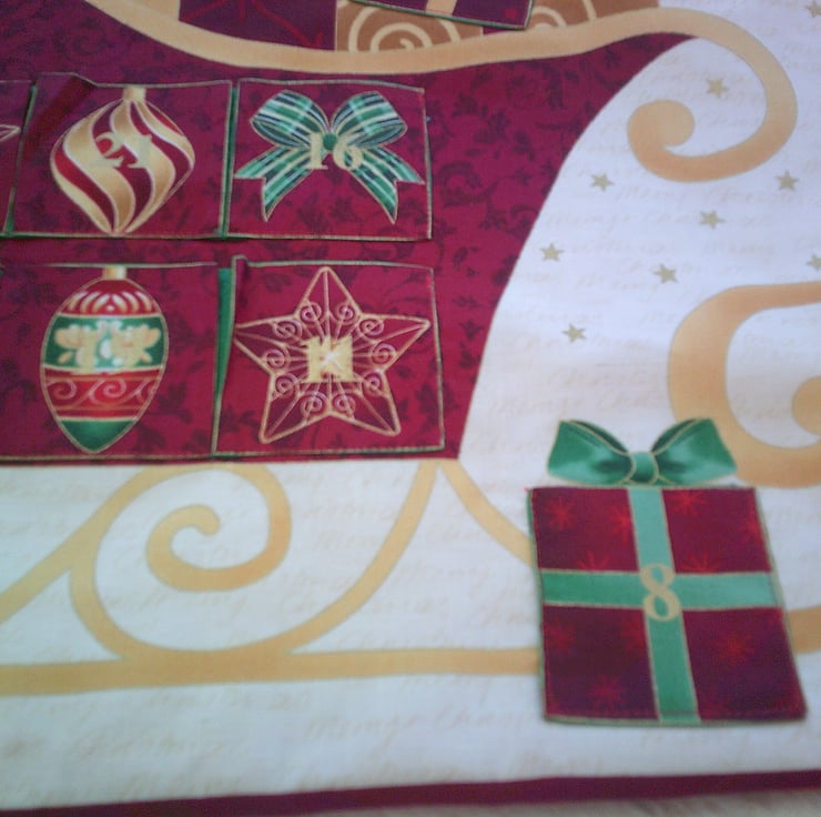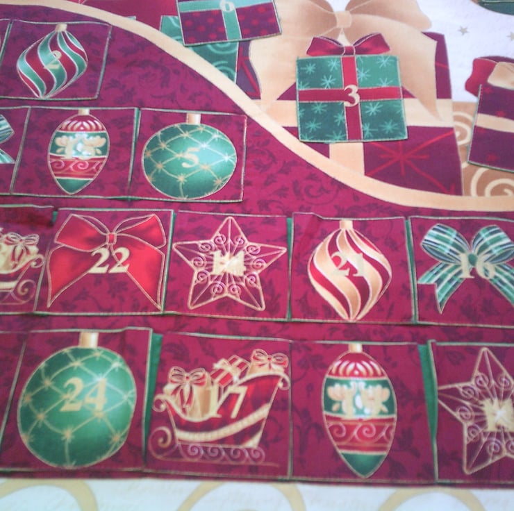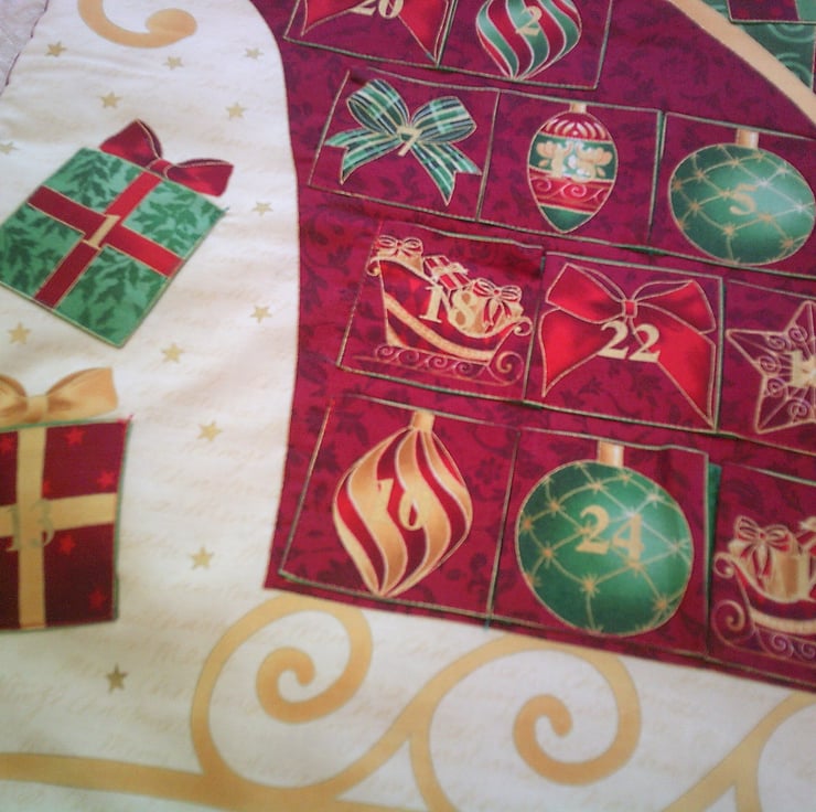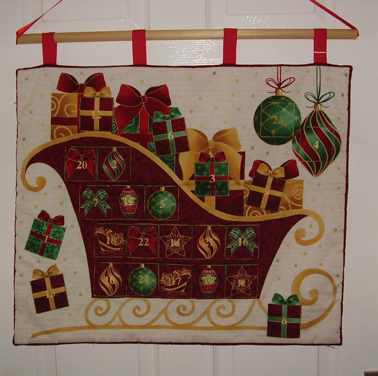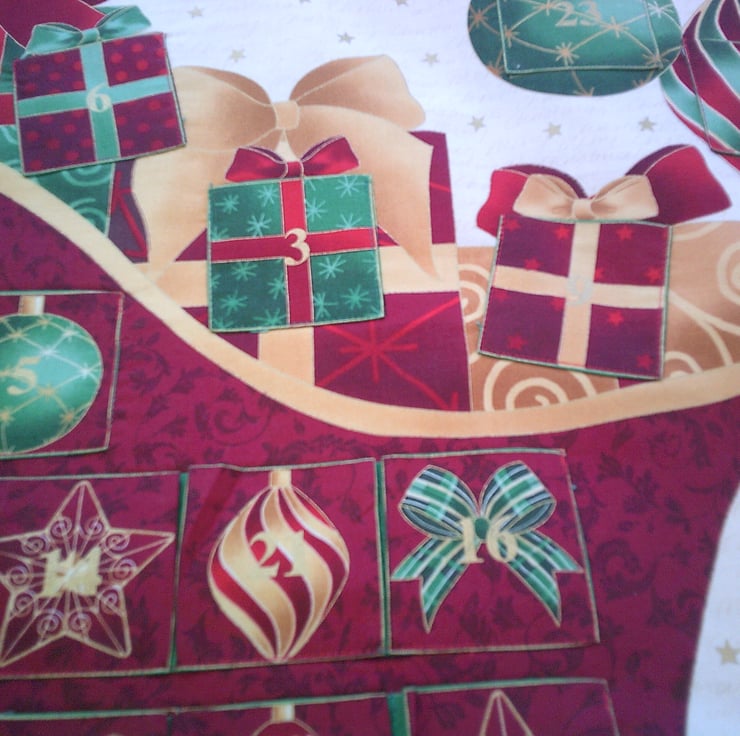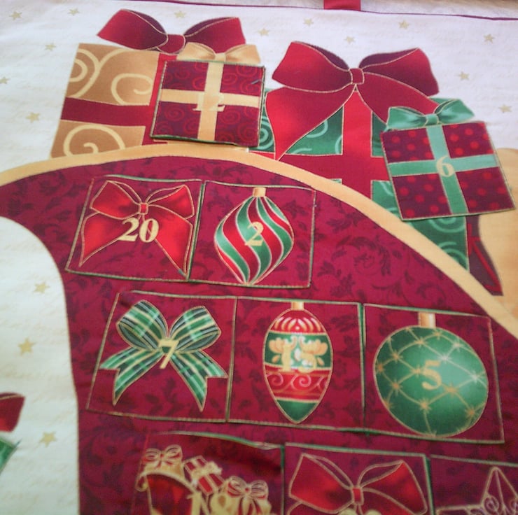 Fabric Advent Calendar featuring a full sleigh of parcels on a cream background. It is backed with red fabric and wadding.
