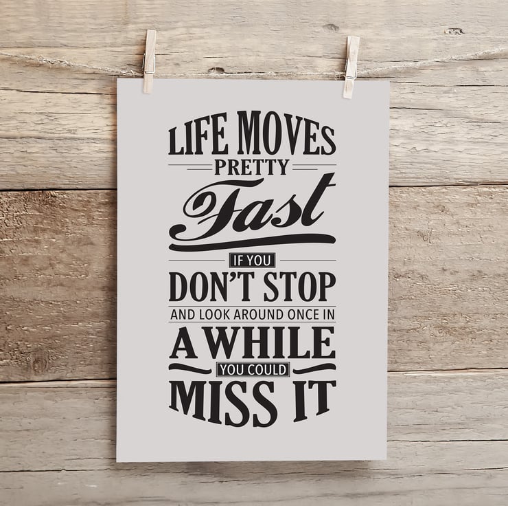 This is a quote from Ferris Bueller's Day Off telling us to stop and smell the roses once in a while and is probably one of the most famous quotes from the massively popular 80's teen comedy movies made by John Hughes. It's sage advice from young Ferris and almost became an anthem for the time, but the sentiment still stands up today.