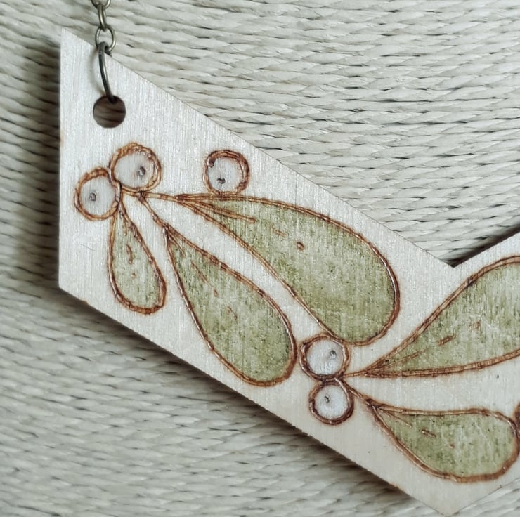 Wooden pendant illustrated with mistletoe using pyrography (wood burning).