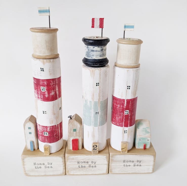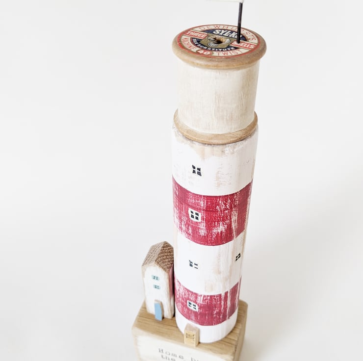 A quirky wooden lighthouse and hut, with a vintage bobbin at the top!