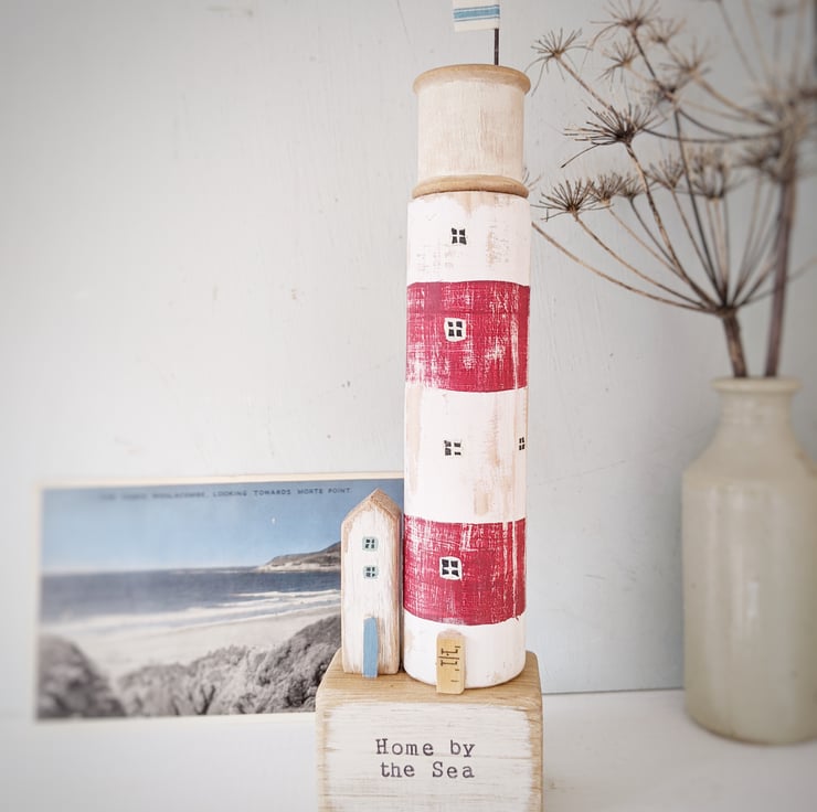 This handcrafted lighthouse is painted in a jaunty red and white with tiny windows and a little door cut from an old ruler piece. By its side is a teeny sea hut.