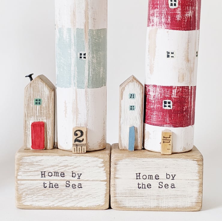 The oak wood block beneath is painted and printed with the words 'Home by the Sea'.