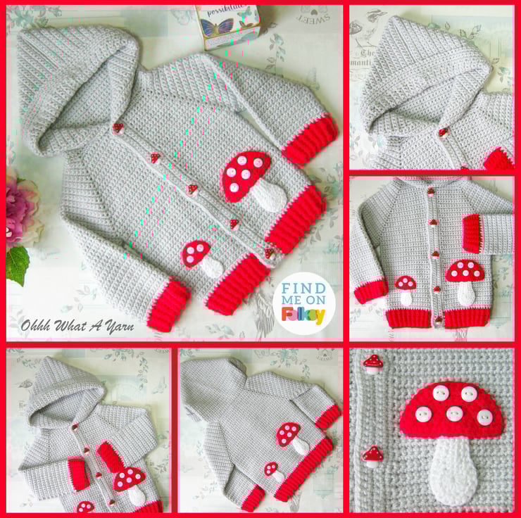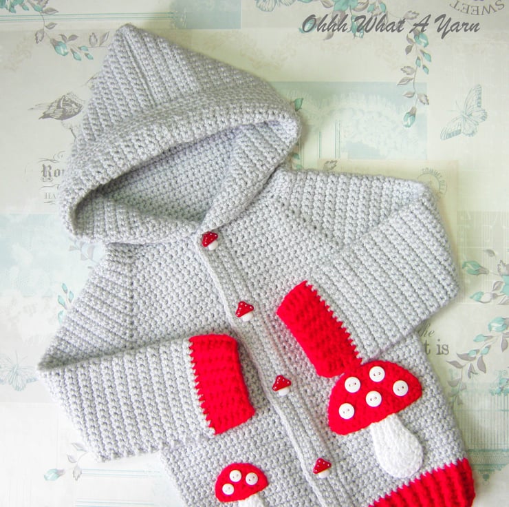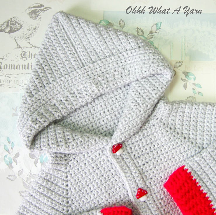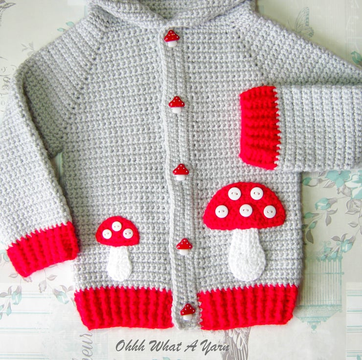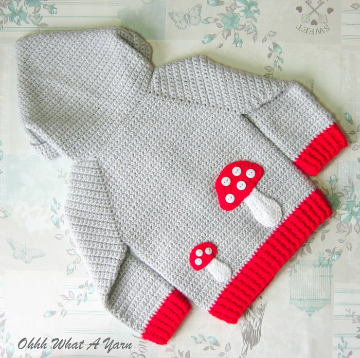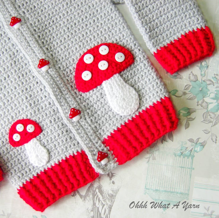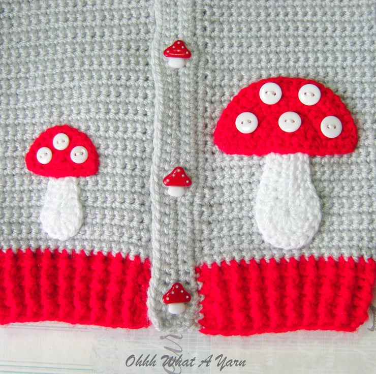 To the front of the jacket I have added one large and one smaller shroom/toadstool applique with button spots. The button band has 5 cute red and white shroom/toadstool buttons.