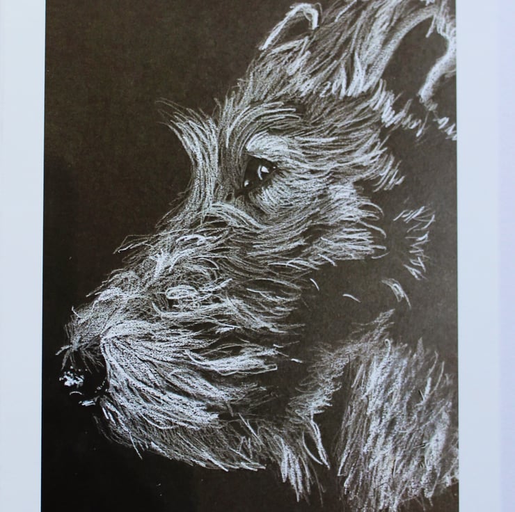 This card is a reproduction of one of my original drawings of my own Fox Terrier Bertie, it was drawn in white pencils on black paper.