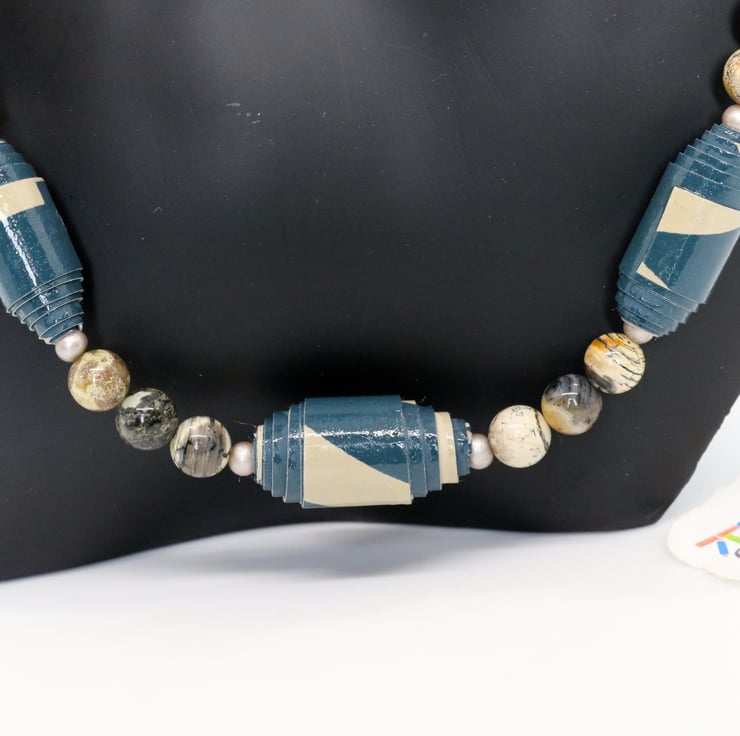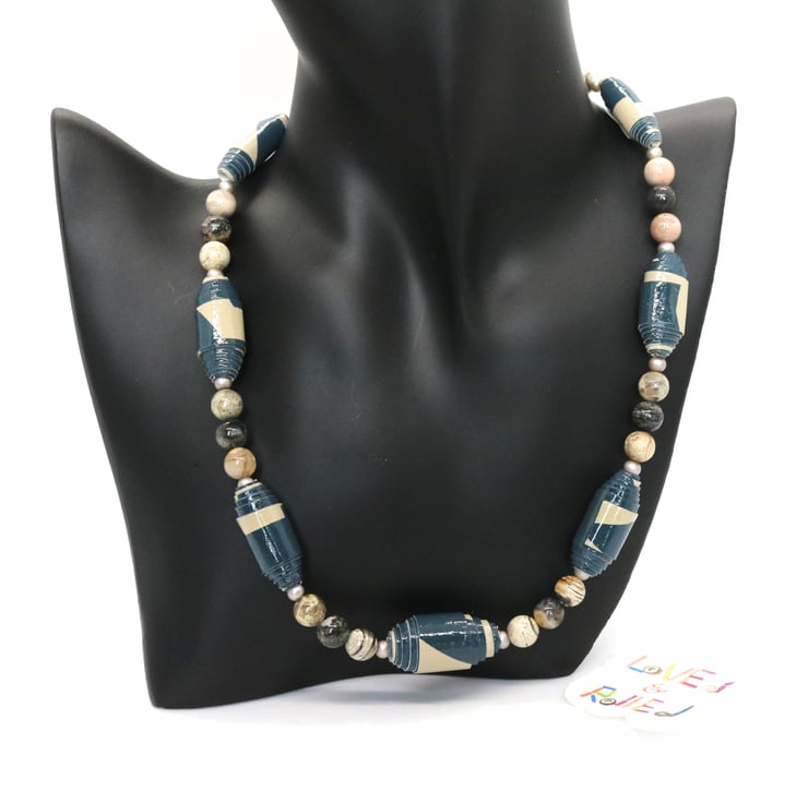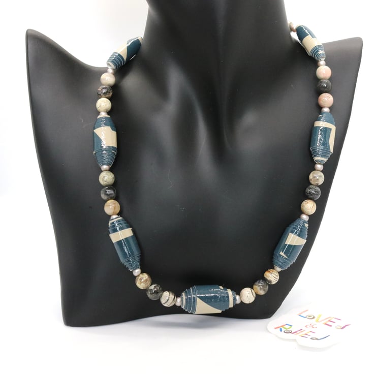 The paper beads were made of scraps of blue and beige wall paper which was cut into strips and hand rolled into beads which were then varnished. The paper beads are very light and contrast with the smooth preloved stone beads which are very sensual and cool to the touch.