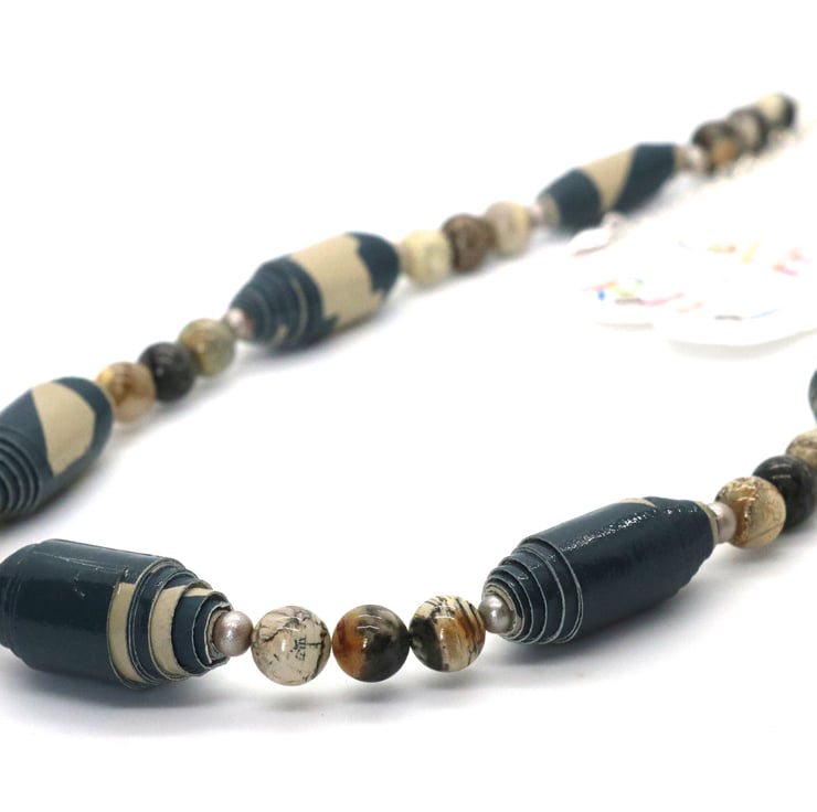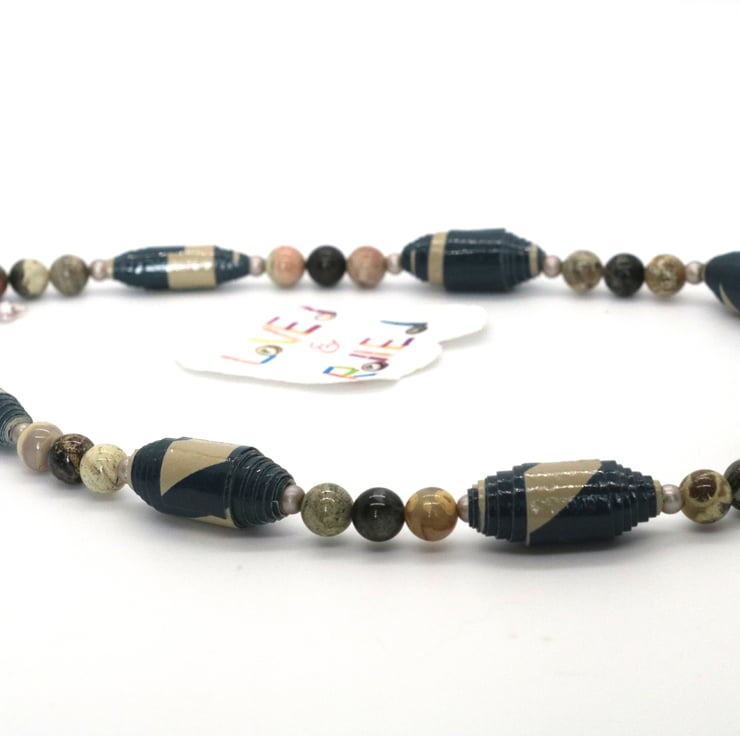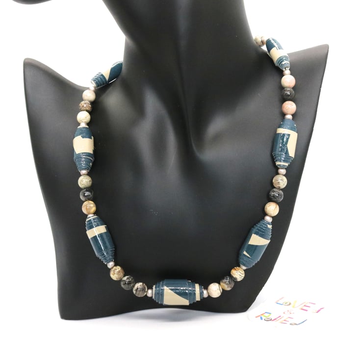 This necklace reminds me of the sea and cliff rocks on a steel grey coloured day. It has a unique charm and feel thanks to the muted colours of its handrolled paper beads and the earthen coloured preloved separator beads.