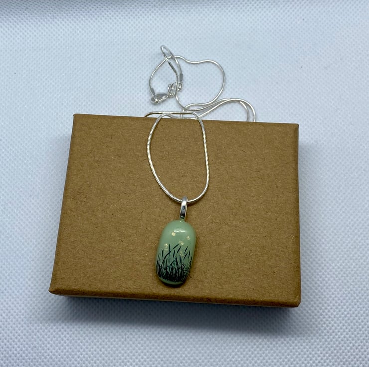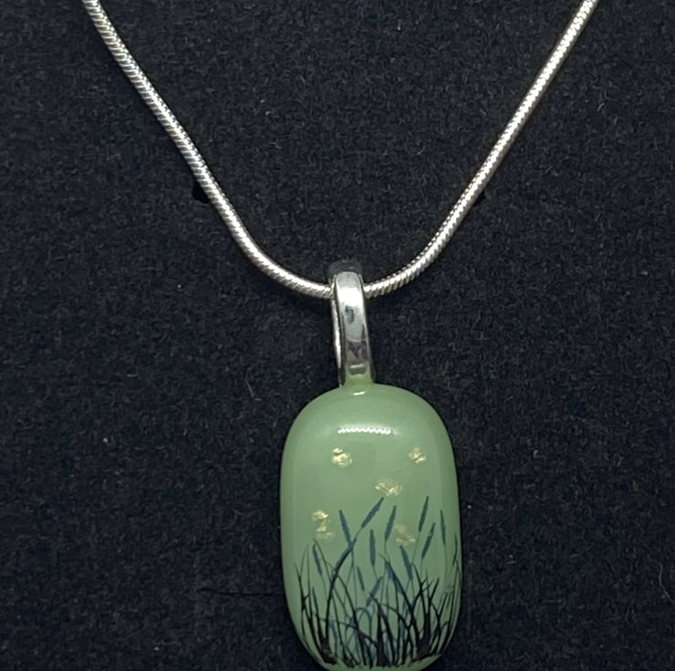Was £10.00 - NOW £5.00 - A delicate fused glass pendant with a pale green background, golden ‘stars’ and dark grasses in the foreground.