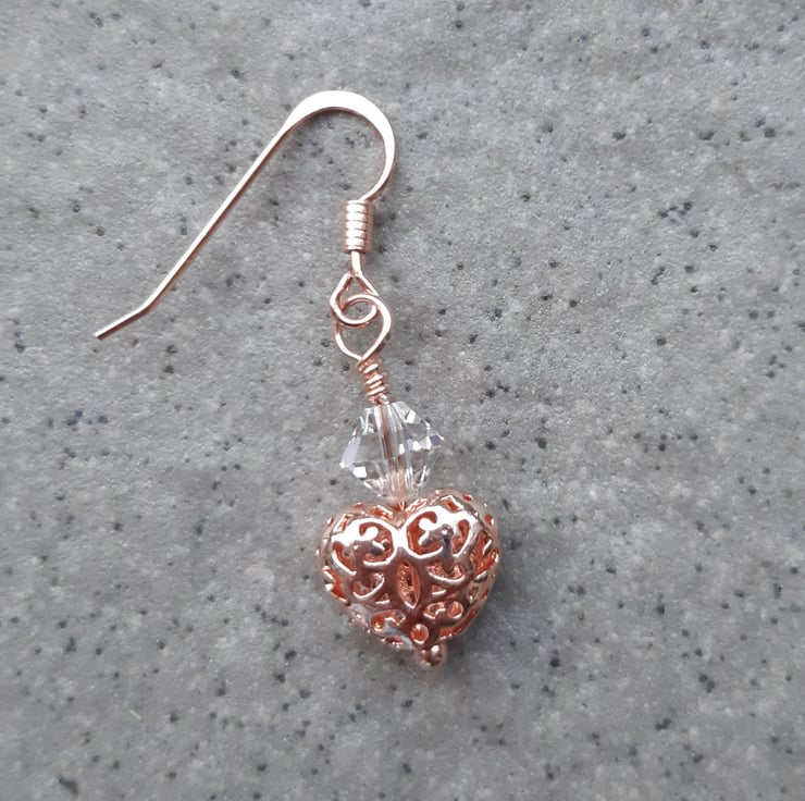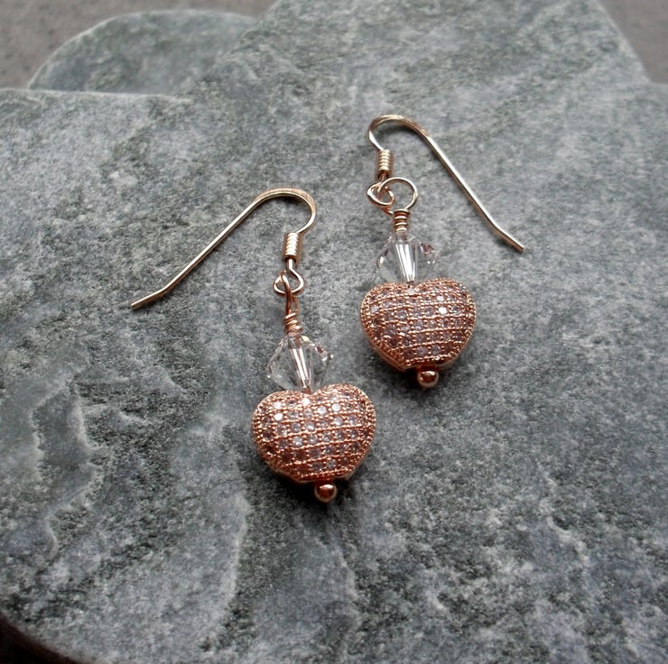 Rose gold coloured base metal hearts with cubic zirconia crystals on the front and lovey filigree detail on the back larger Swarovski® bicone crystals are attached to rose gold vermeil ear wires (rose gold plated sterling silver)