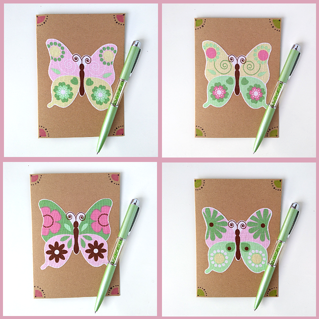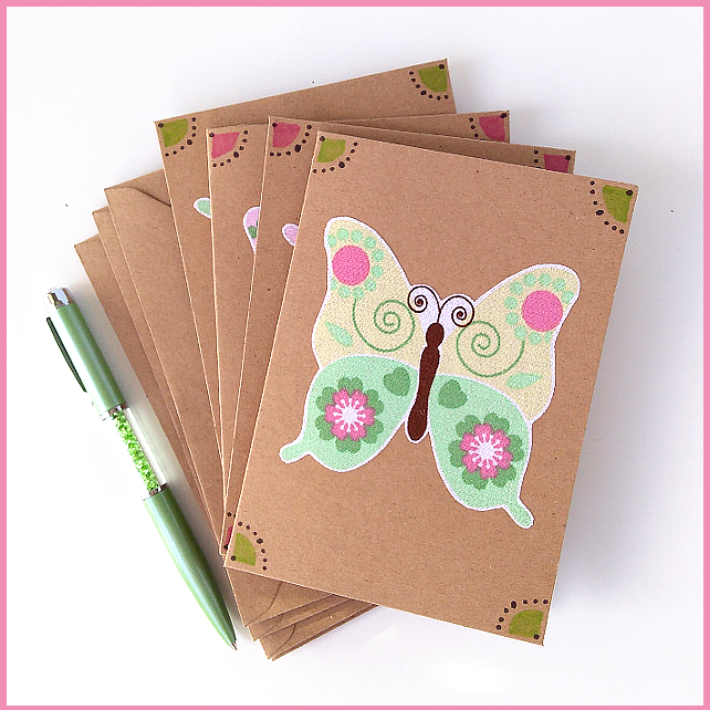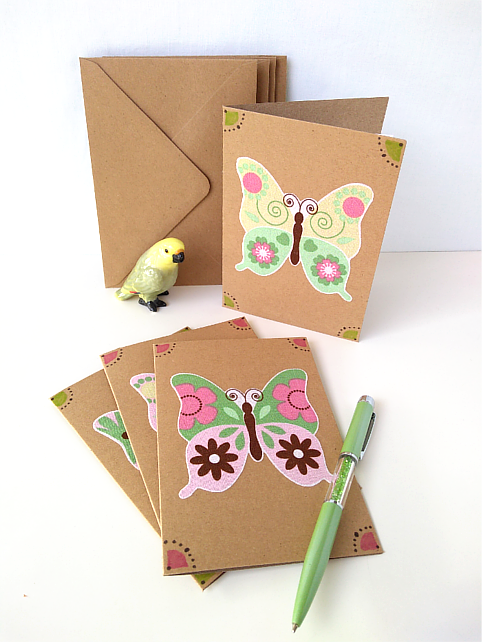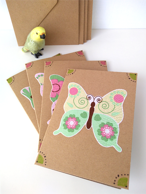 This listing is for a set of four blank cards with applique butterfly detail on the front in shades of green, pink and yellow. The colourful butterflies are positioned on elegantly decorated, brown cards. Each card has an ivory paper insert for your message.