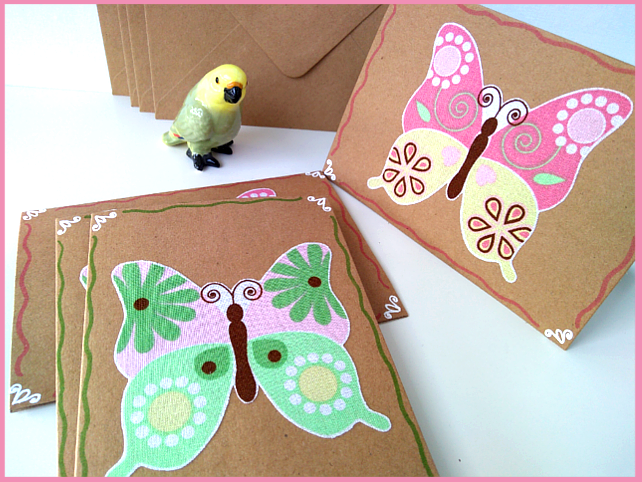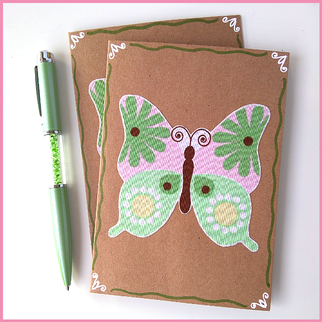 This listing is for a set of four blank cards with fabric applique butterfly detail on the front in shades of green, pink and yellow. The colourful butterflies are positioned on elegantly decorated, brown cards. Each card has an ivory paper insert for your greeting.