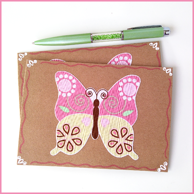 This listing is for a set of four blank cards with fabric applique butterfly detail on the front in shades of green, pink and yellow. The colourful butterflies are positioned on elegantly decorated, brown cards. Each card has an ivory paper insert for your greeting.