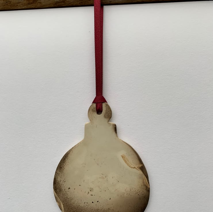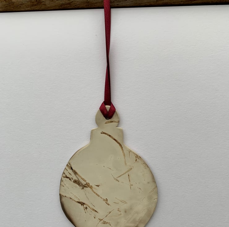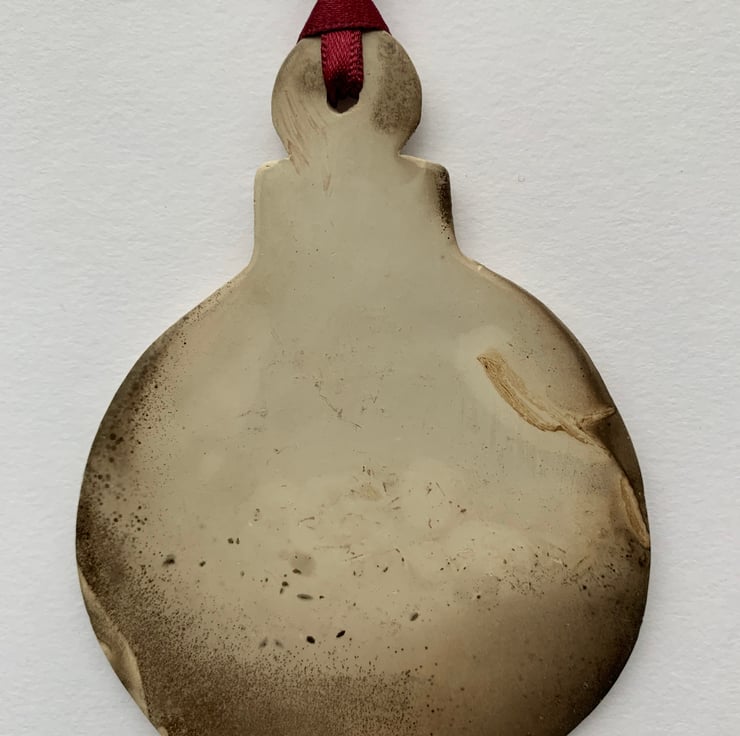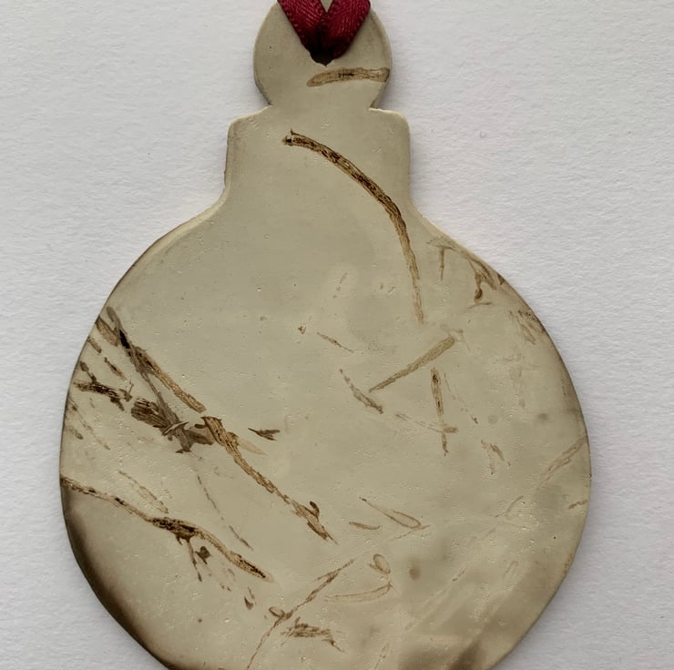 The amazing marks on this porcelain bauble are created by firing the work in a pit. The decorations have been wrapped in copper wire, steel wire and salt soaked cloth; they are then placed in the pit with various organic materials including seaweed, banana skins, nut shells etc. The pit is then filled up with sawdust and wood and set alight. When the fire has reached enough temperature it creates a reaction with the organic materials and wire additions to produce the wonderful marks left on the clay. When it has burnt down it is covered and left overnight. It is incredibly exciting opening the pit the next day. Once unearthed, the decorations are scrubbed and then waxed to enhance the colours and seal the clay.