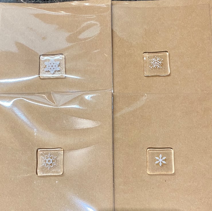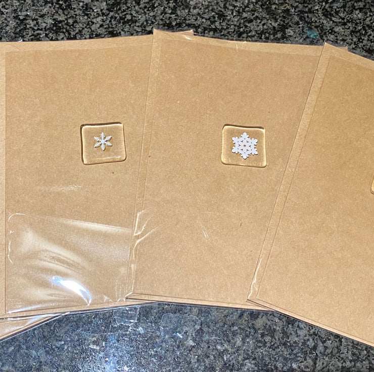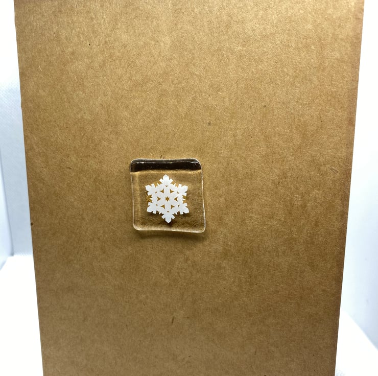 These Kraft brown Christmas cards feature a fused glass snowflake in the centre measuring approximately 3cm x 3cm.