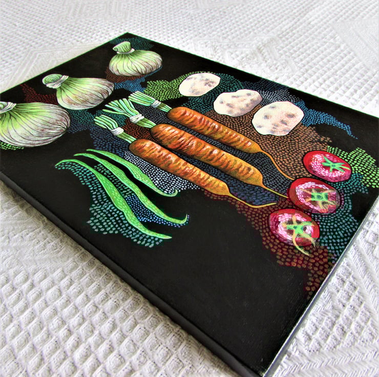 This painting of vegetables on a black background is in acrylic paint on a 30cm x 20.5cm slim edged (1.5cm) canvas. It is supplied ready for display. The moment I saw these prize winning vegetables displayed on black velvet I knew I had to paint them. They are the crown jewels of a local gardener and these vegetables had been as carefully prepared as a Hollywood star at the Oscars!
