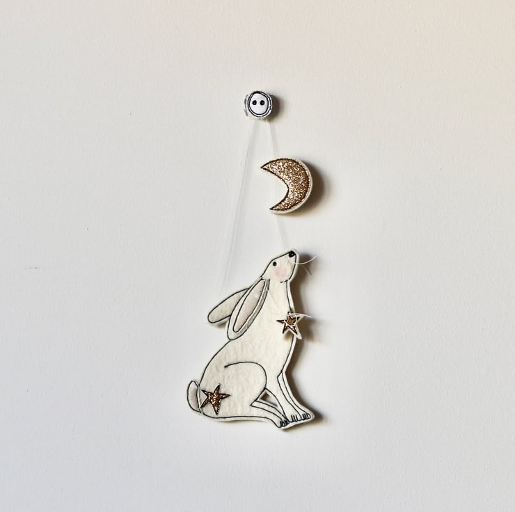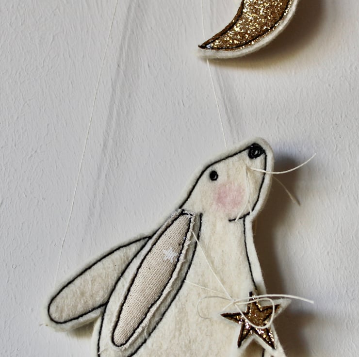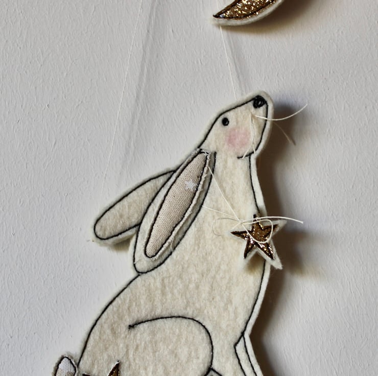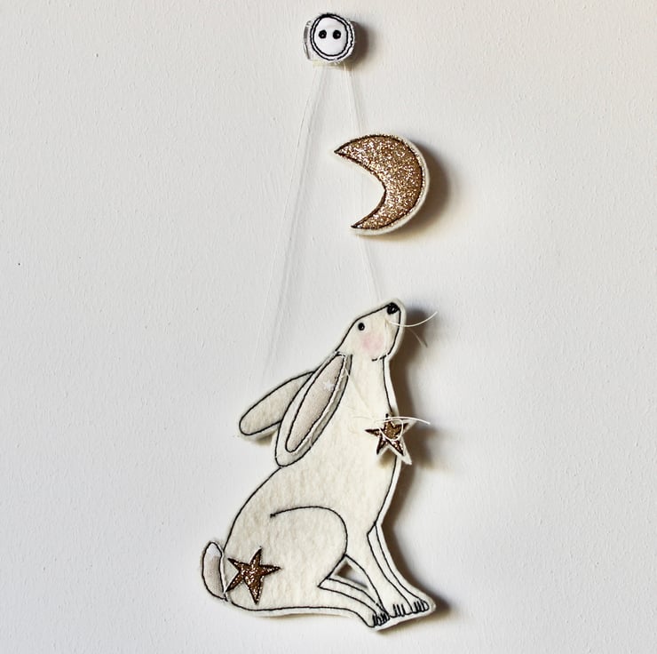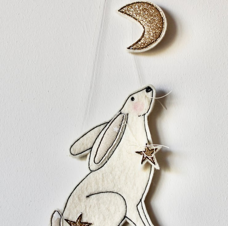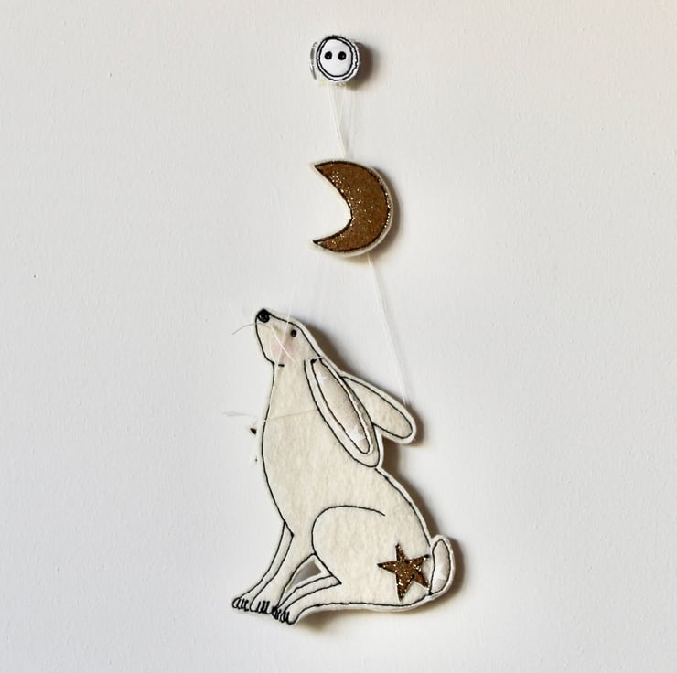 Little hare and the golden glittery moon are sewn using 100% wool felt, glitter cloth, cotton cloth and free hand machine embroidery; multiple layers of cloth are sewn together and cut out by hand using very sharp scissors. With linen whiskers and a linen string to suspend.