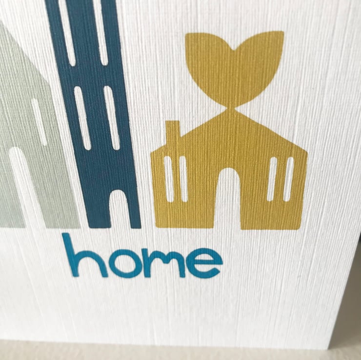 A simple contemporary silhouette of 3 little houses in citrine yellow, light grey and navy blue with a teal colour pop. The simple word 'home' adds an understated sophistication. A high quality inkjet print on 260gsm premium quality linen textured white card this A6 card also comes with a beautiful steel grey envelope. The cards and envelopes are bound by a simple paper band making the cards and their packaging totally recyclable. All my cards are printed with water based inks.