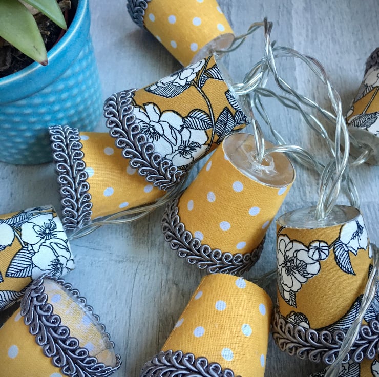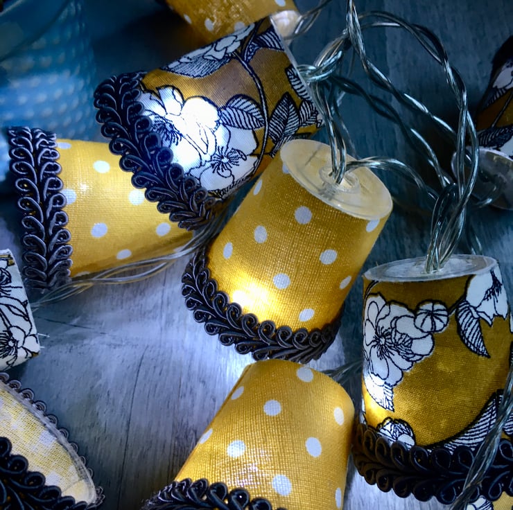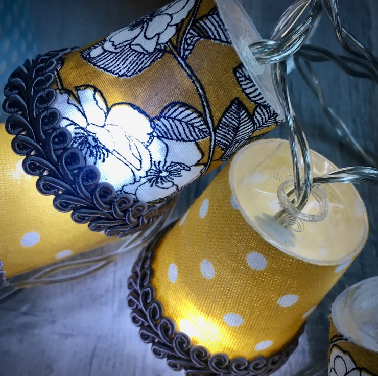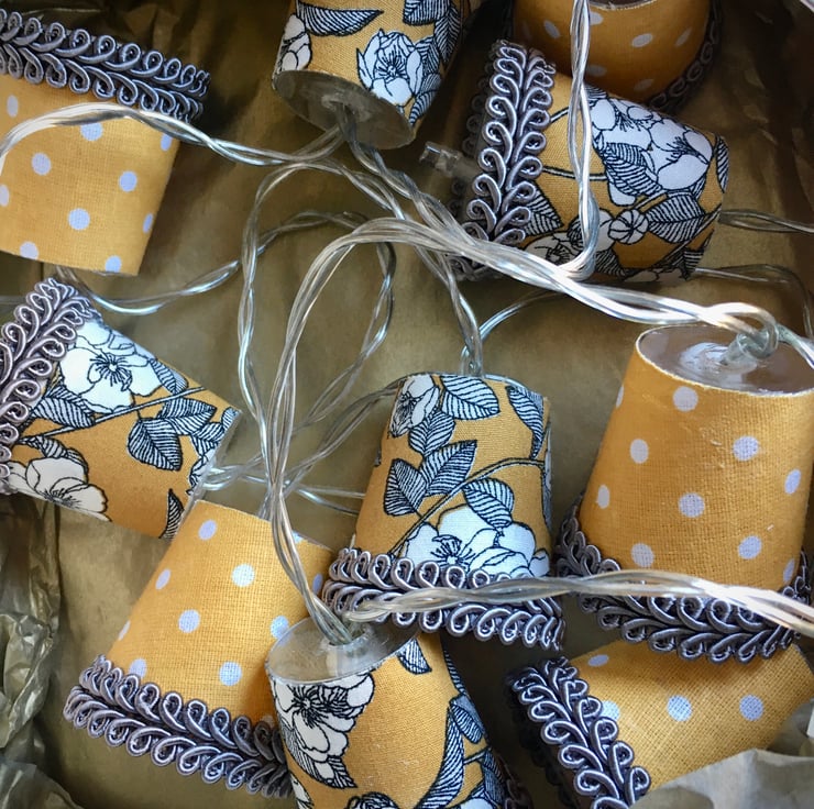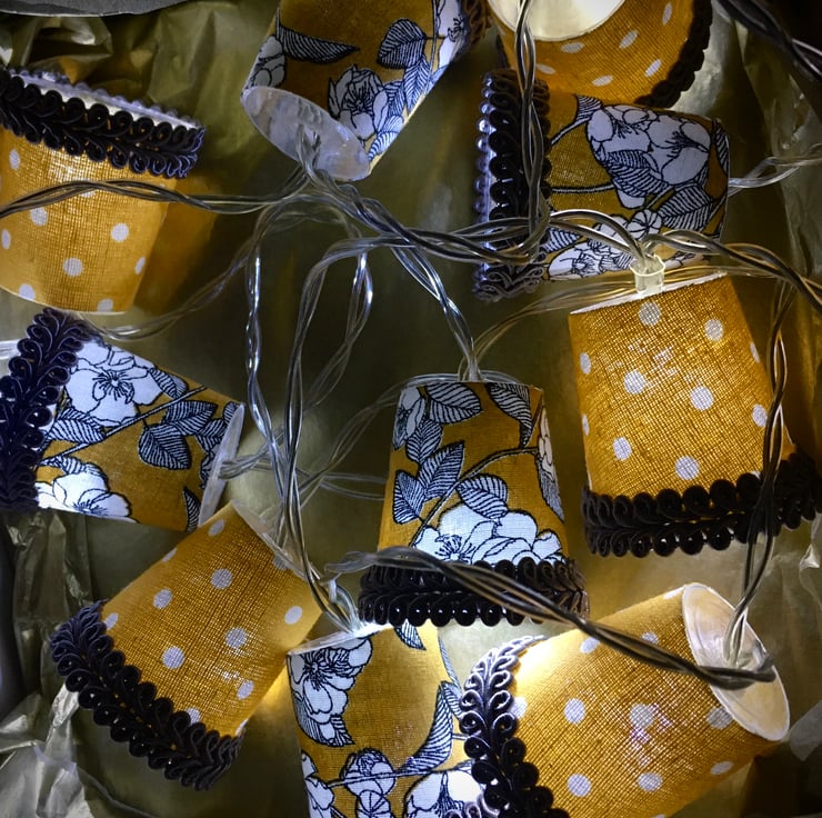 I also do custom lights to order, and can even use your own special fabric, so please contact me if you would like a particular colour combination to fit with your decor, or have a specific fabric in mind. Just remember that these are mini lampshades, so the prints I use have to be mini too!