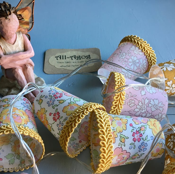 There are ten mini lampshades in each set on a battery-operated string of warm white fairy lights. The length overall length is 1.8 metres, and the length from first mini lampshade to last is 1.2 metres.