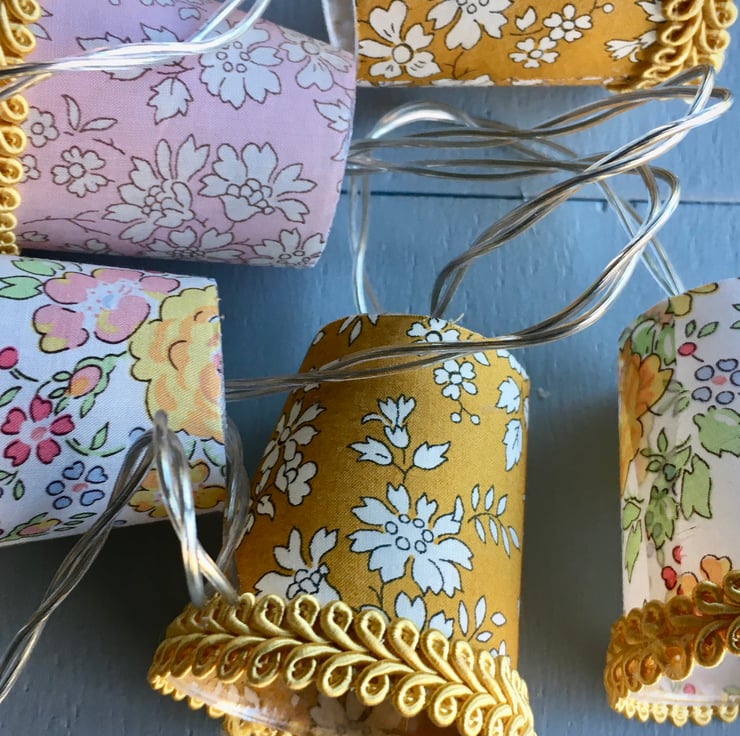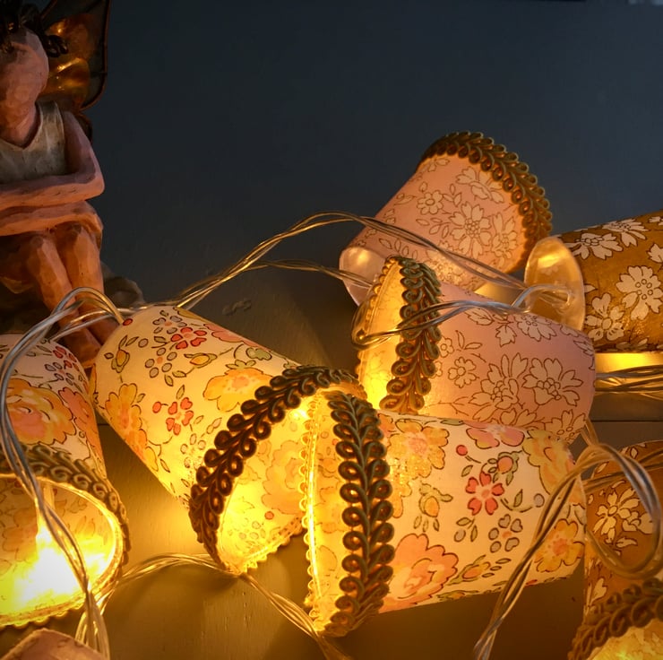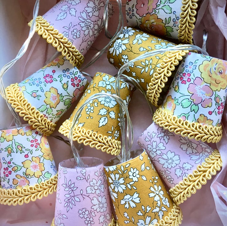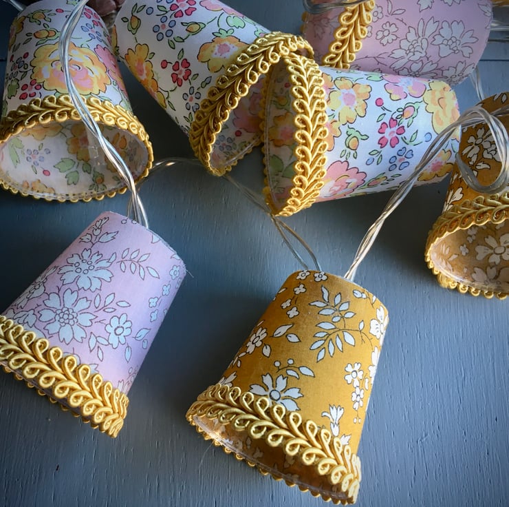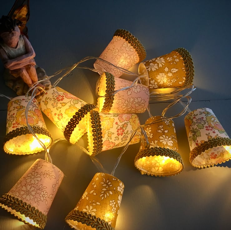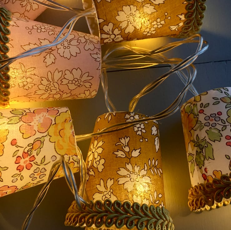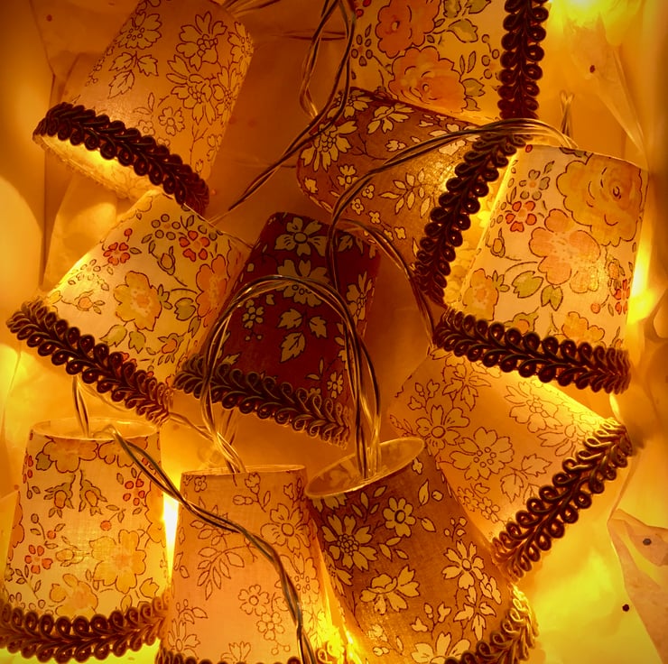 These mini lampshades are perfect to drape along a mantlepiece or shelf, around the head of a bed, or strung across a mirror or picture frame.