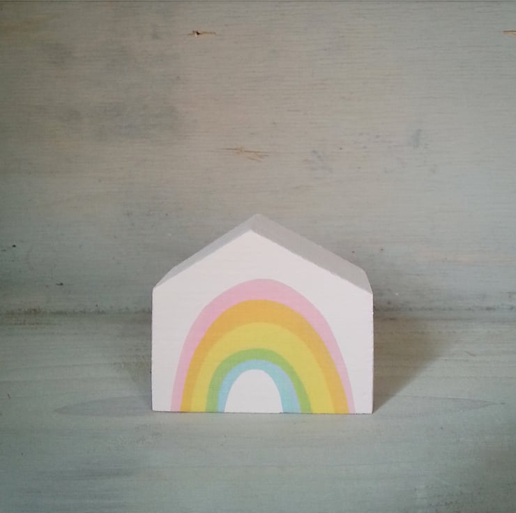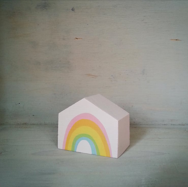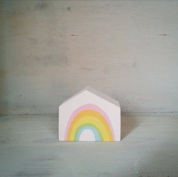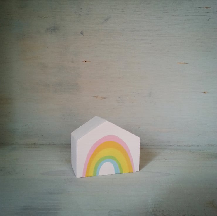 This one of a kind little wooden house is made from reclaimed wood and is painted in pale pink and decorated with a rainbow transfer.