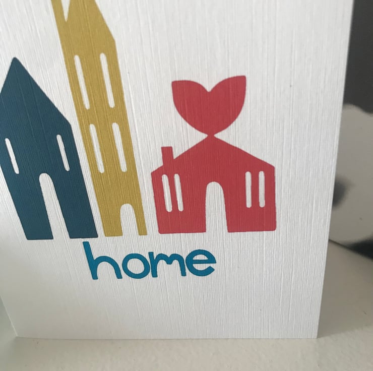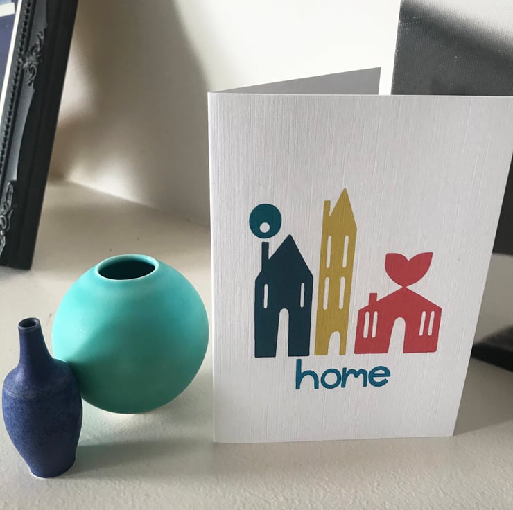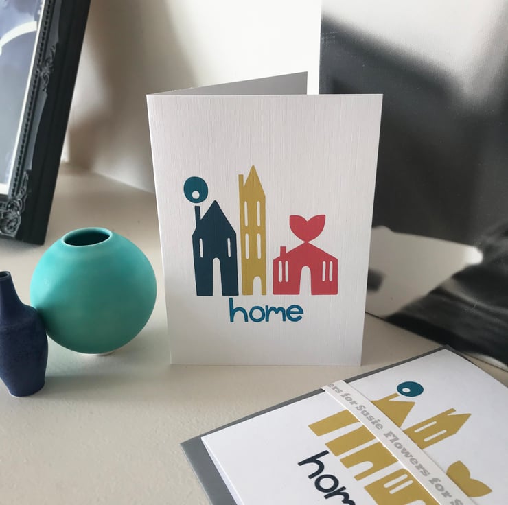 A simple silhouette of 3 little houses in navy blue, citrine yellow and pastel red with a blue colour pop. The simple word 'home' adds an understated sophistication to this contemporary card. A high quality inkjet print on 260gsm premium quality linen textured white card this A6 card also comes with a beautiful steel grey envelope. The cards and envelopes are bound by a simple paper band making the cards and their packaging totally recyclable.
