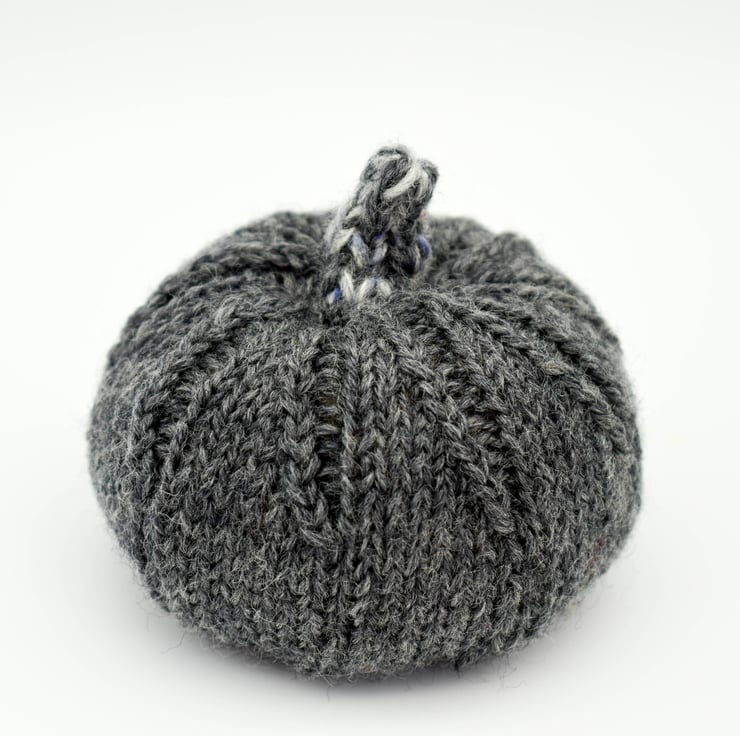 Charcoal grey pumpkin with lighter grey stalk. Made from wool yarn and toy grade wool stuffing.