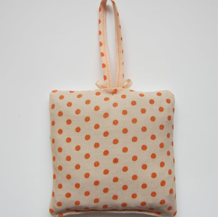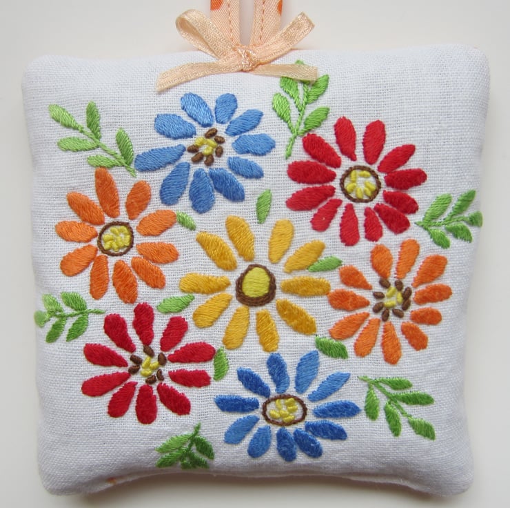 Hanging lavender sachet with a vintage embroidered flower and leaf design front in lovely bright colours. The back and loop are in a coordinating orange and peach spotty fabric.