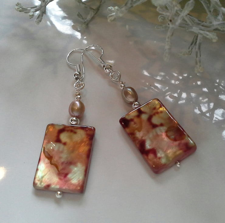A warm looking pair of earrings designed and lovingly hand crafted using quality champagne colour rice shaped genuine fresh water pearls and elongated specialist dyed and printed 14mm by 20mm mother of pear gemstones. The treatment is a life time finish. For the remaining components quality silver plate has been used to reduce costs. They can be made in all 925 sterling silver if required. Please contact the designer for a price.