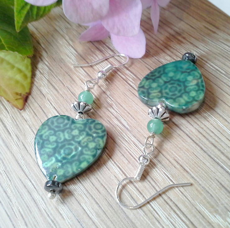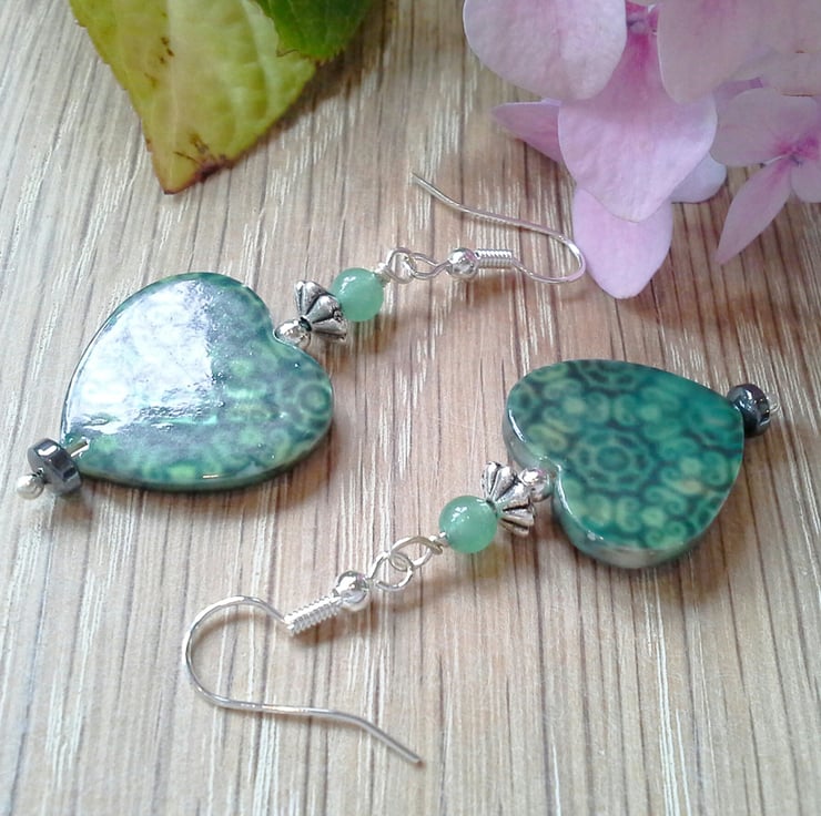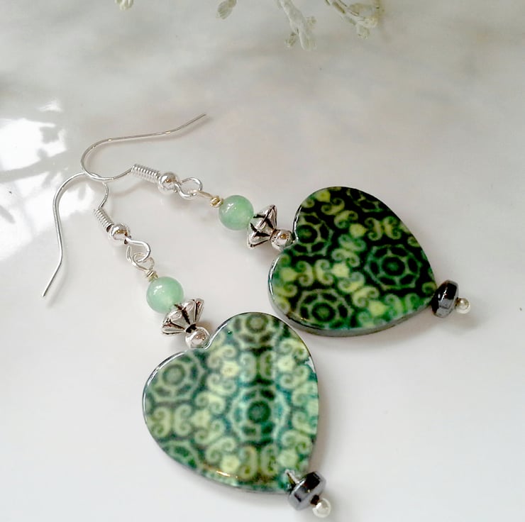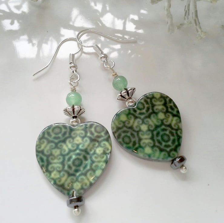 A sweet pair of earrings designed and hand crafted using specialist printed heart shaped mother of pearl complimented with 4mm genuine green aventurine smooth gemstone rounds. All other components are quality silver plated to keep costs down. They can be ordered in all 925 sterling silver if preferred, please contact the designer for a price.