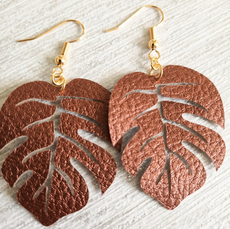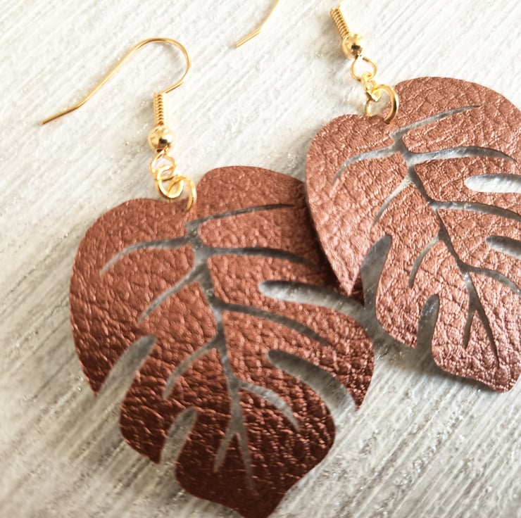 Celebrate autumn with these copper coloured faux leather monster leaf earrings. The leaves hang from gold plated fish hooks.
