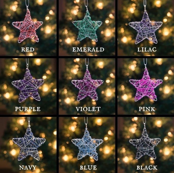 The stars measure approx. 5cm point to point, & just under 1cm thick. They each come with a silver string loop ready for hanging. The colours available are: Red; Emerald; Lilac; Purple; Violet; Pink; Navy; Blue; Black. Please list the colours you would like using the 'choose options' button - if you want less than four colours please confirm the quantities of each (i.e. 3x Pink 1x Emerald).