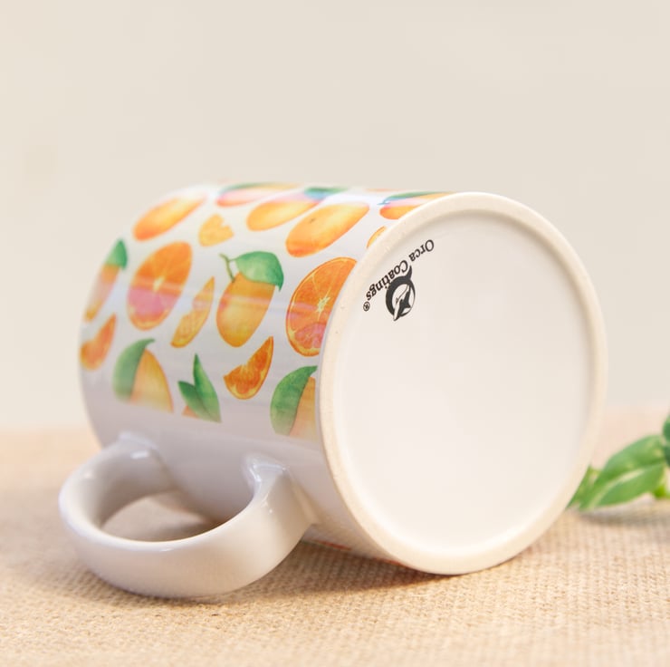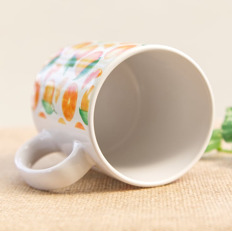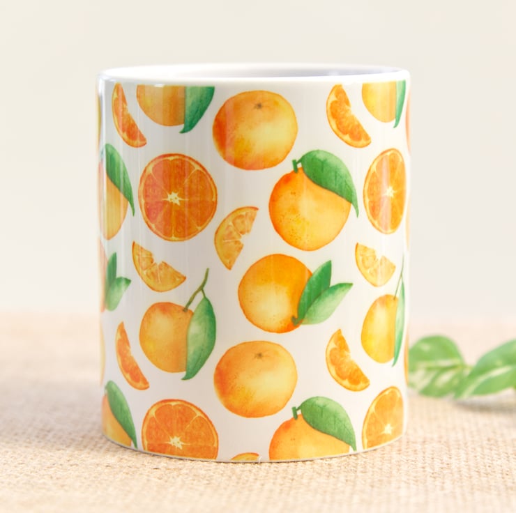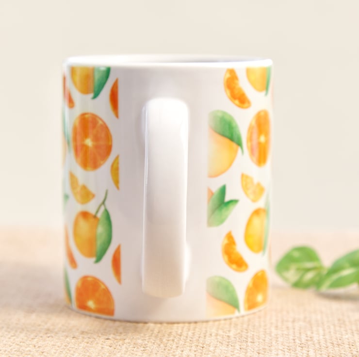A bright and cheerful mug featuring an orange citrus fruit pattern. The pattern was originally done in watercolour, scanned into the computer and then heat sublimated onto the ceramic mug.