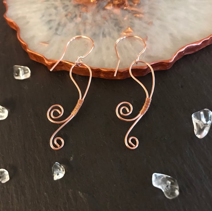 Simple, minimalist copper scroll earrings. Fully hand formed from .8mm copper wire, including the ear wires. These are very lightweight and comfortable to wear for any occasion.