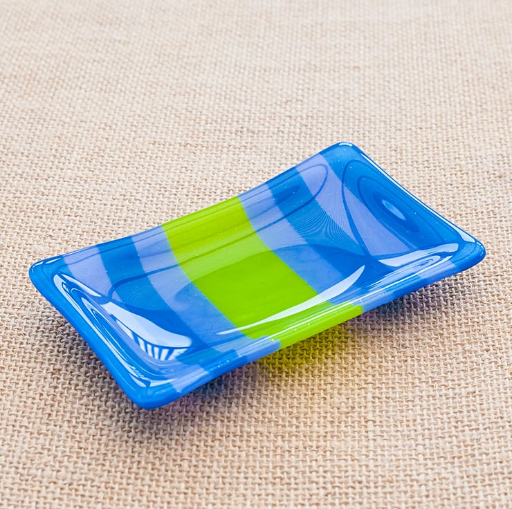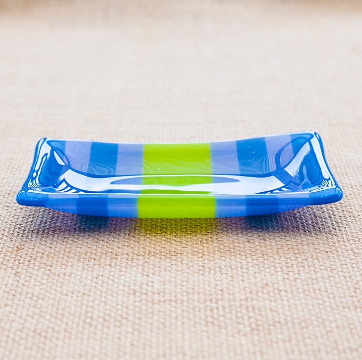 A stunning handmade slumped glass dish with alternating blue, lavender and green stripes. This dish can be used for a variety of things from being a soap dish to holding jewellery items to being a tealight holder.