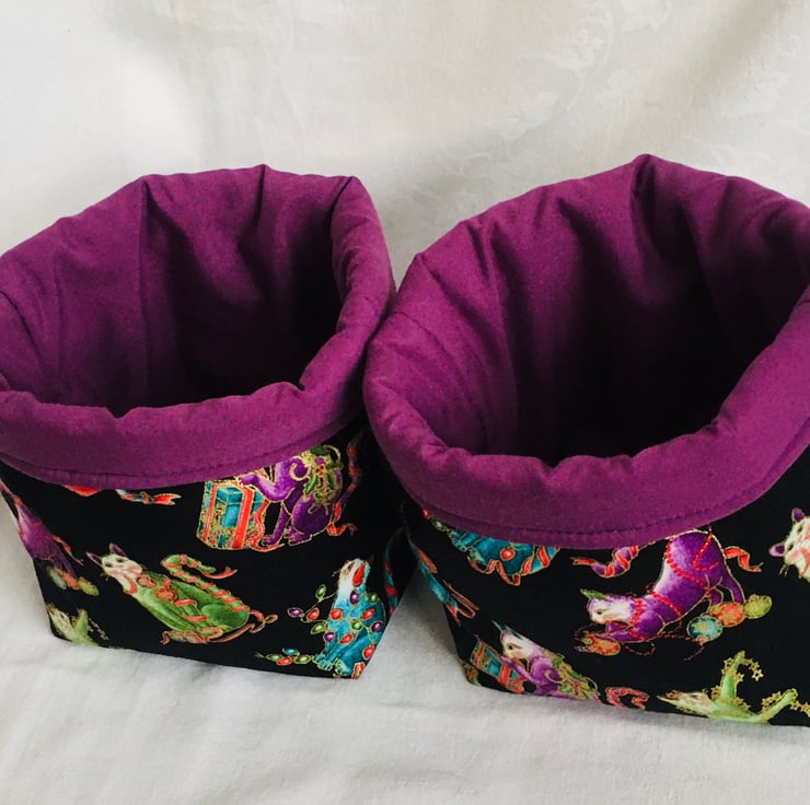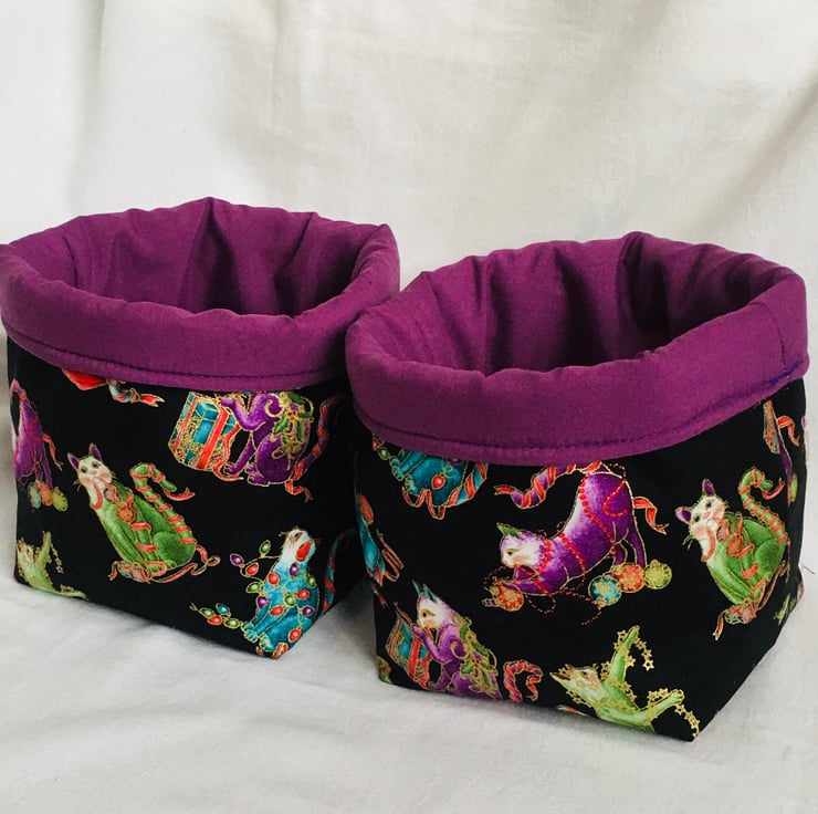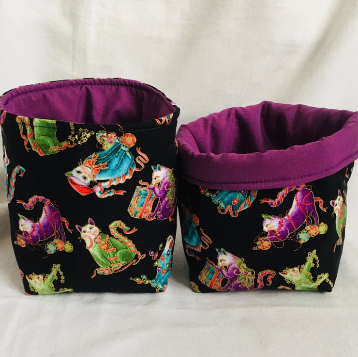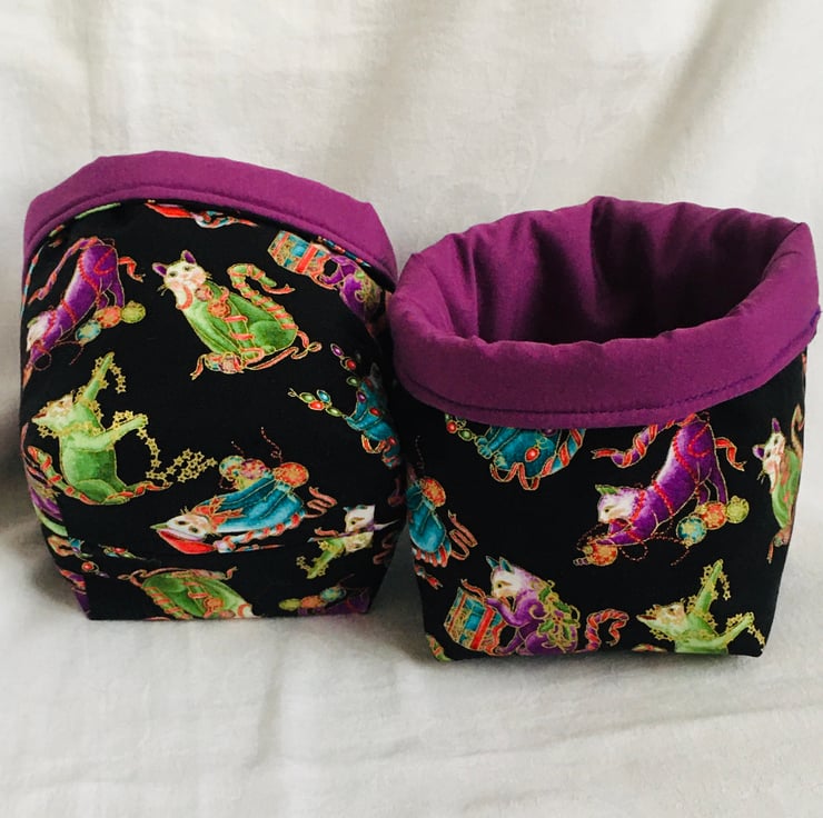 The boxes have been made using tight weave quilting cotton with a Christmas cats playing print to make the outer fabric, lined with a plain cotton and thick batting used for stabilizing the structure. Each box can be left upright or the tops can be folded down to give contrast and to height desired.